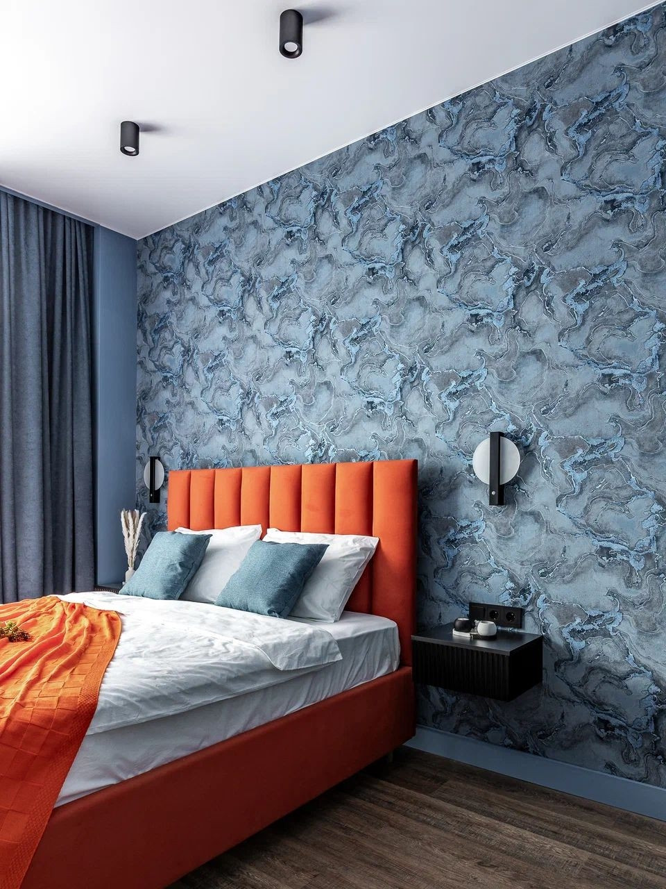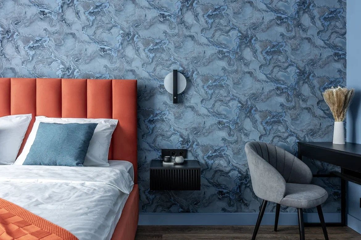 В спальне двухспальная кровать , тумбочки , столик и удобный мягкий стул.