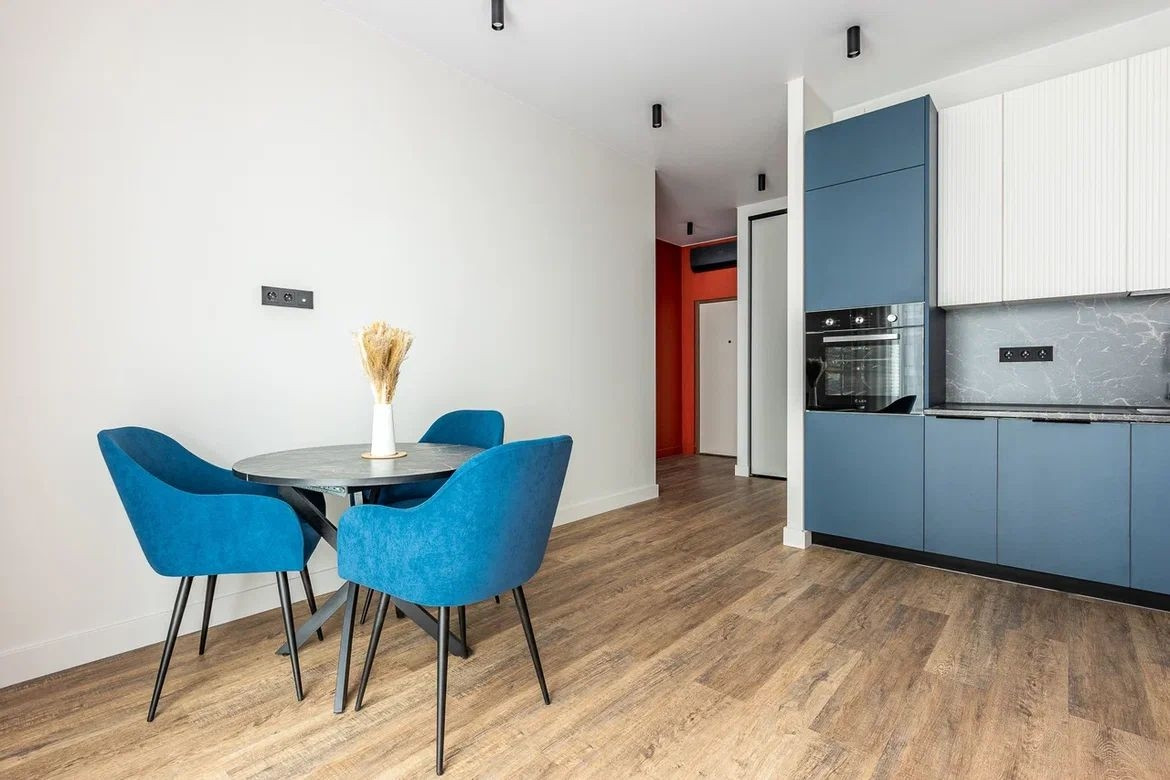 Кухня-гостиная: кухонный гарнитур из МДФ на заказ со встроенной бытовой техникой на гарантии (варочная панель на 3 конфорки, посудомоечная машина 45см , духовка, вытяжка, холодильник), большой круглый раздвижной стол. Диван -кровать сделанный на заказ .