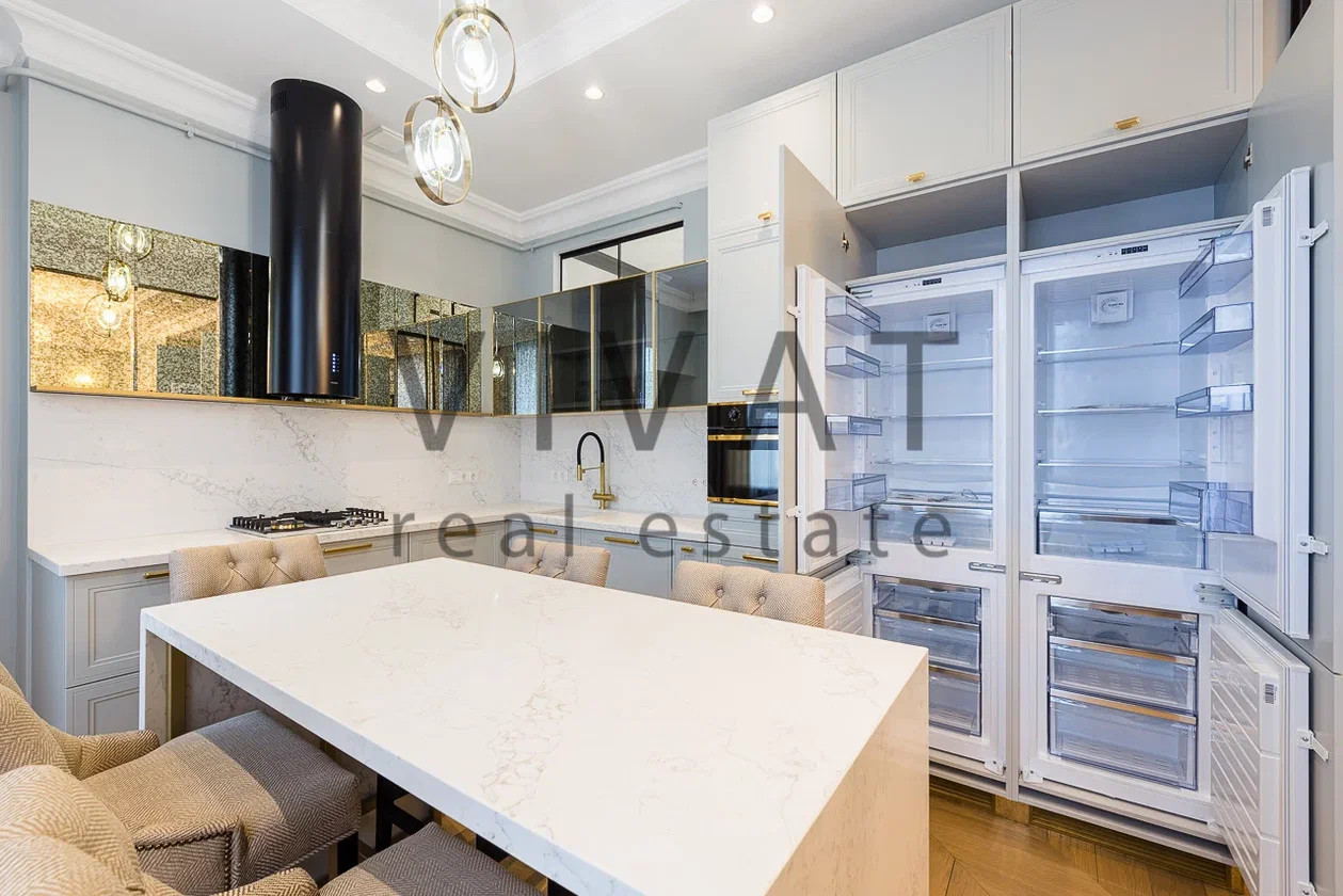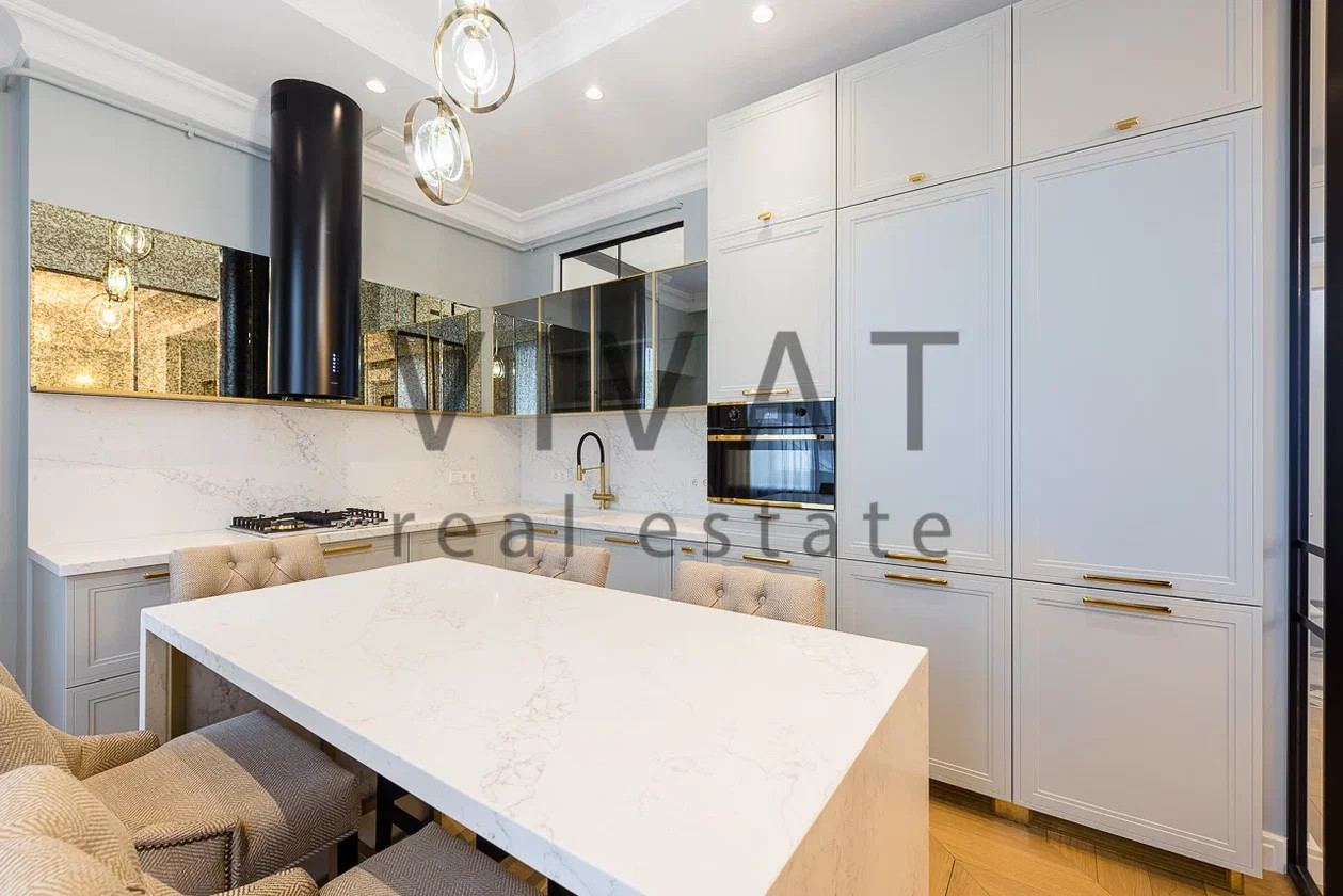 Кухня-столовая 13,5 кв.м. Цвет кухонной мебели практически совпадает с цветом стен, создавая впечатление воздушности пространства. Монохромность разбавлена аксессуарами из латуни. Техника от лучших производителей.