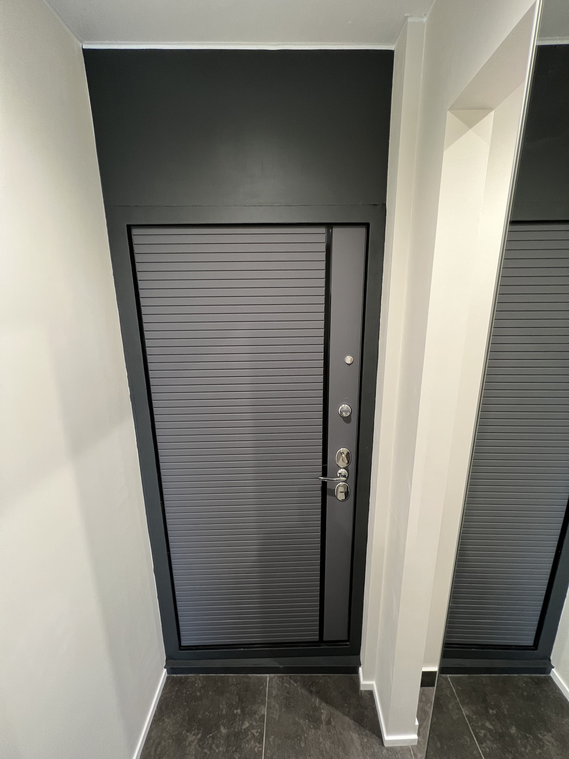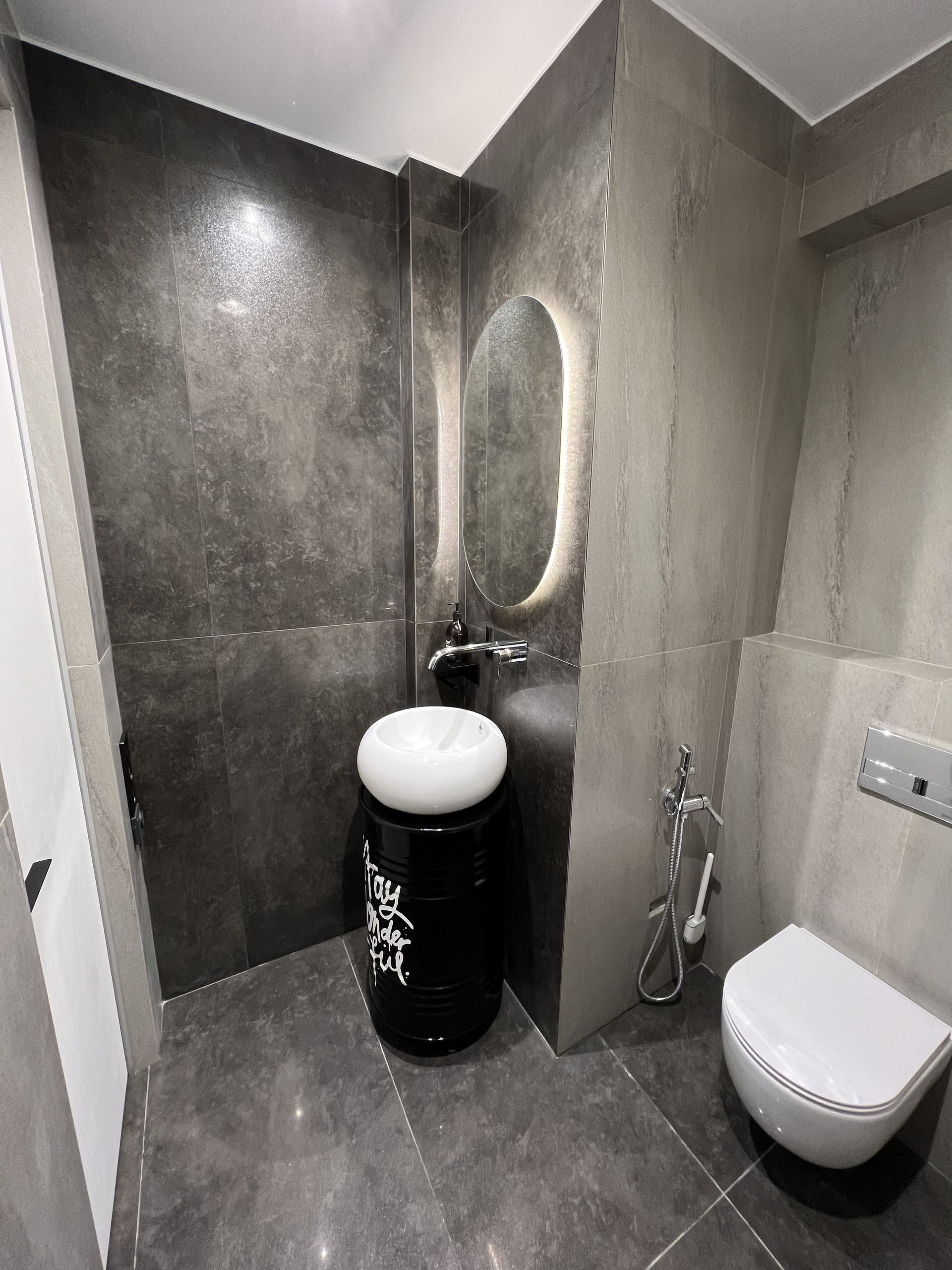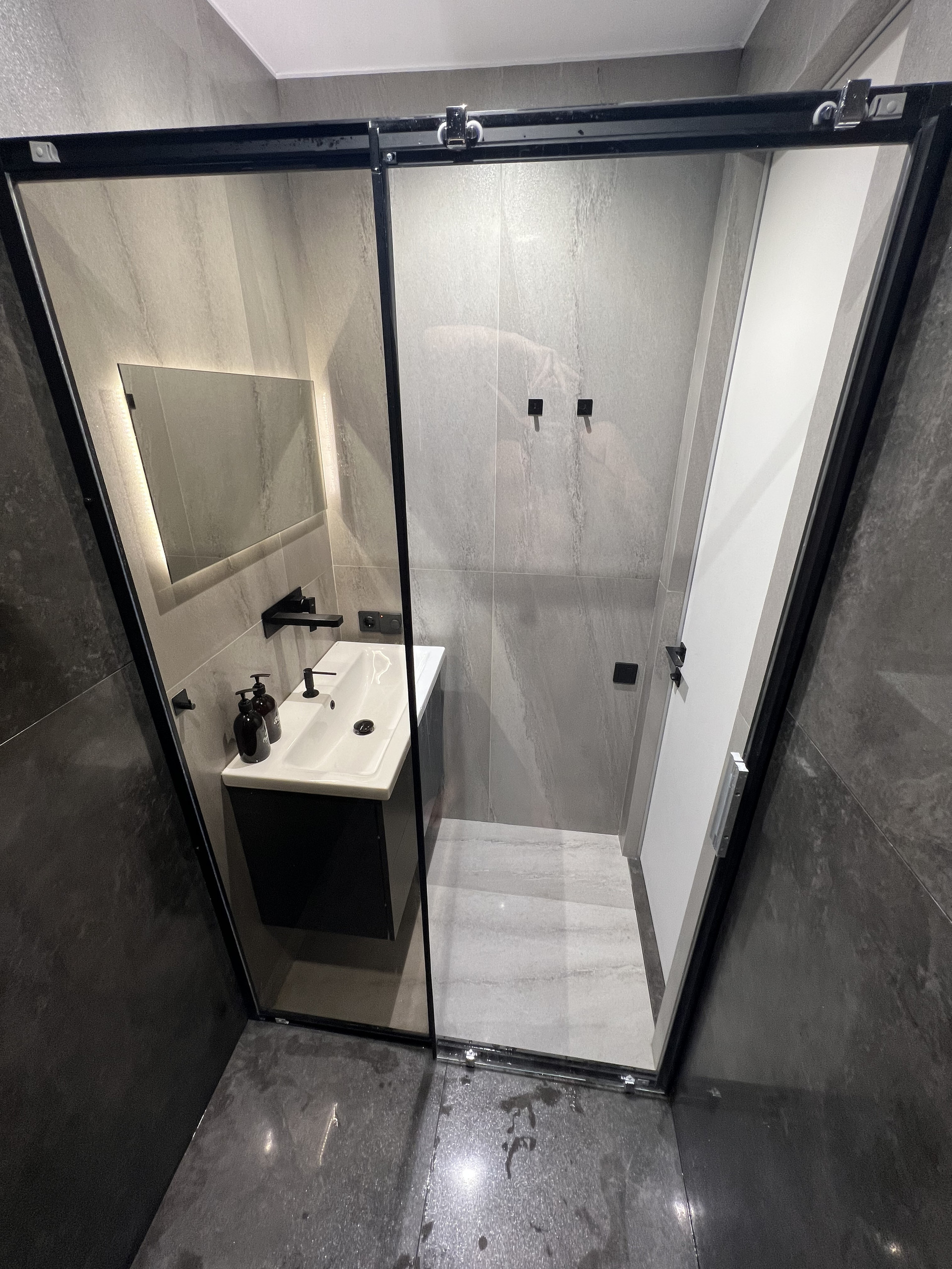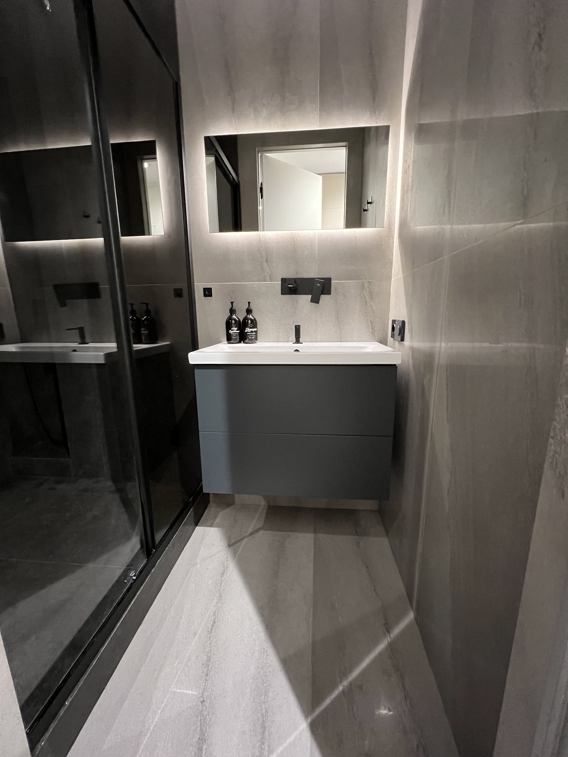 Раздельные душевая и туалет, отделка широкоформатным керамогранитом.