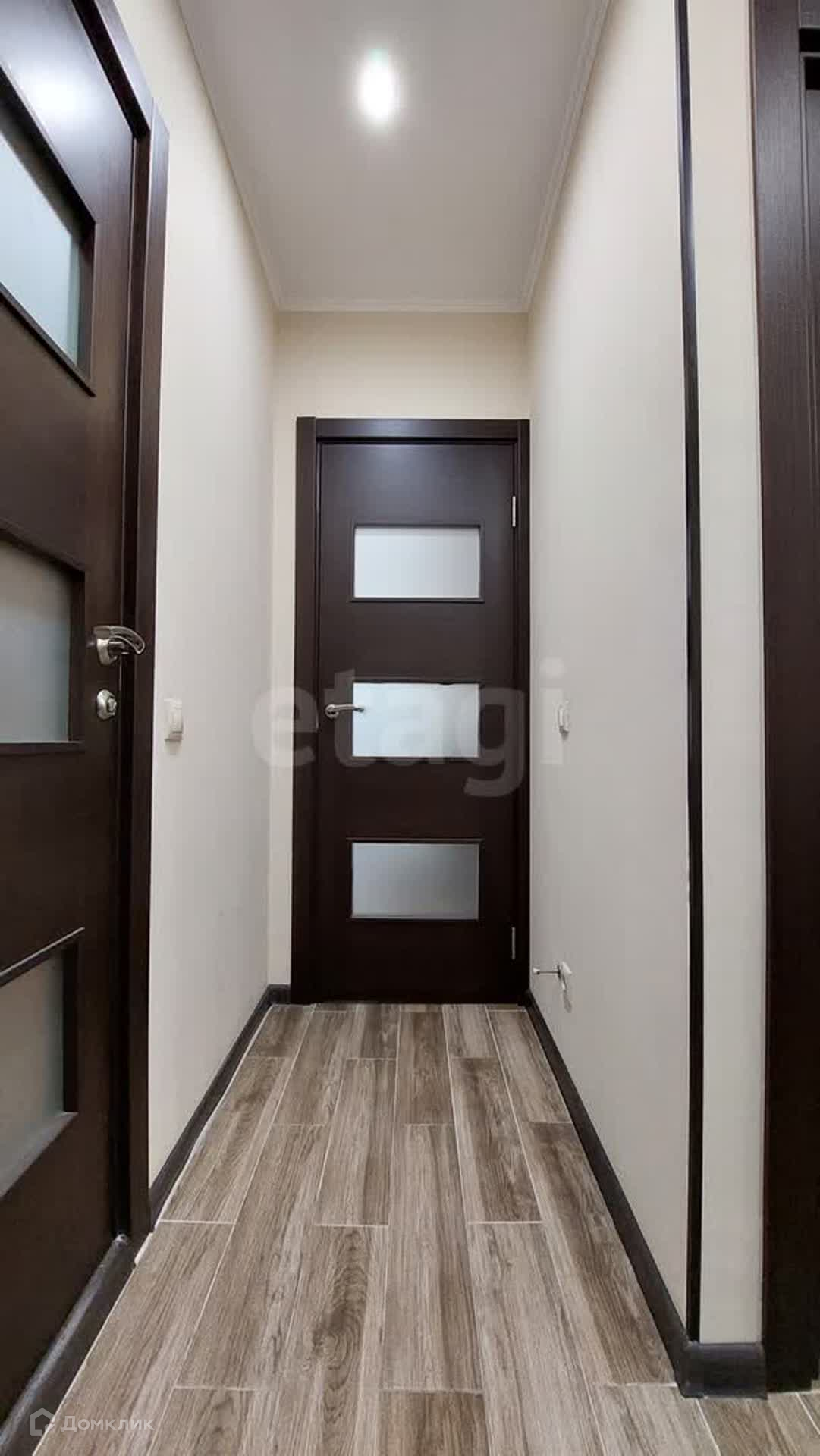Натяжной потолок со встроенными светильниками. На полу положен ламинат. Вместительный шкаф-купе в коридоре.