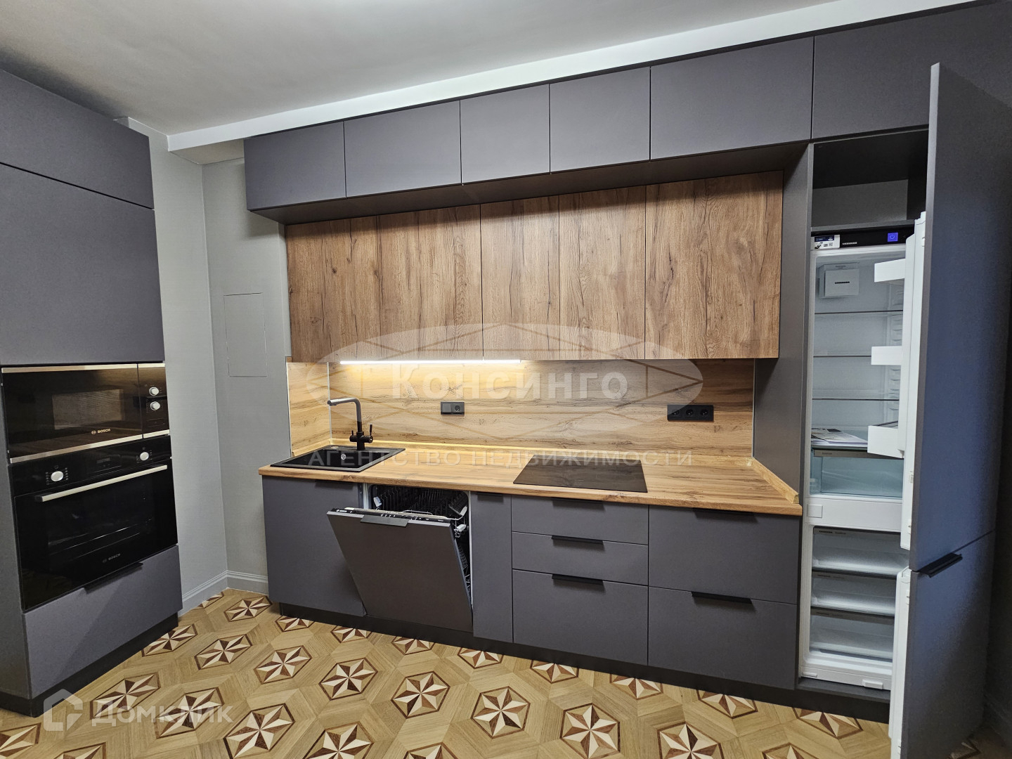 Встроенная техника: Широкая посудомоечная машина BOSCH, индукционная варочная панель BOSCH, духовой шкаф BOSCH, СВЧ BOSCH, встроенный холодильник LIEBHERR.