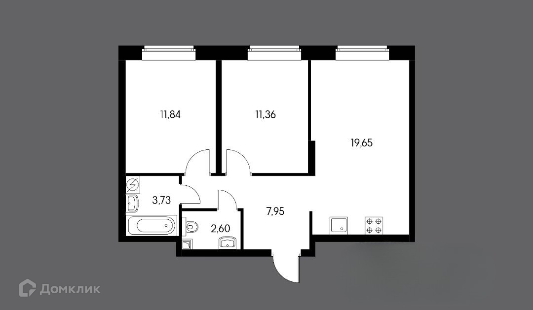 Большая кухня-гостиная 19.65 м2, две изолированные комнаты: 11.84 м2 и 11.36м2.