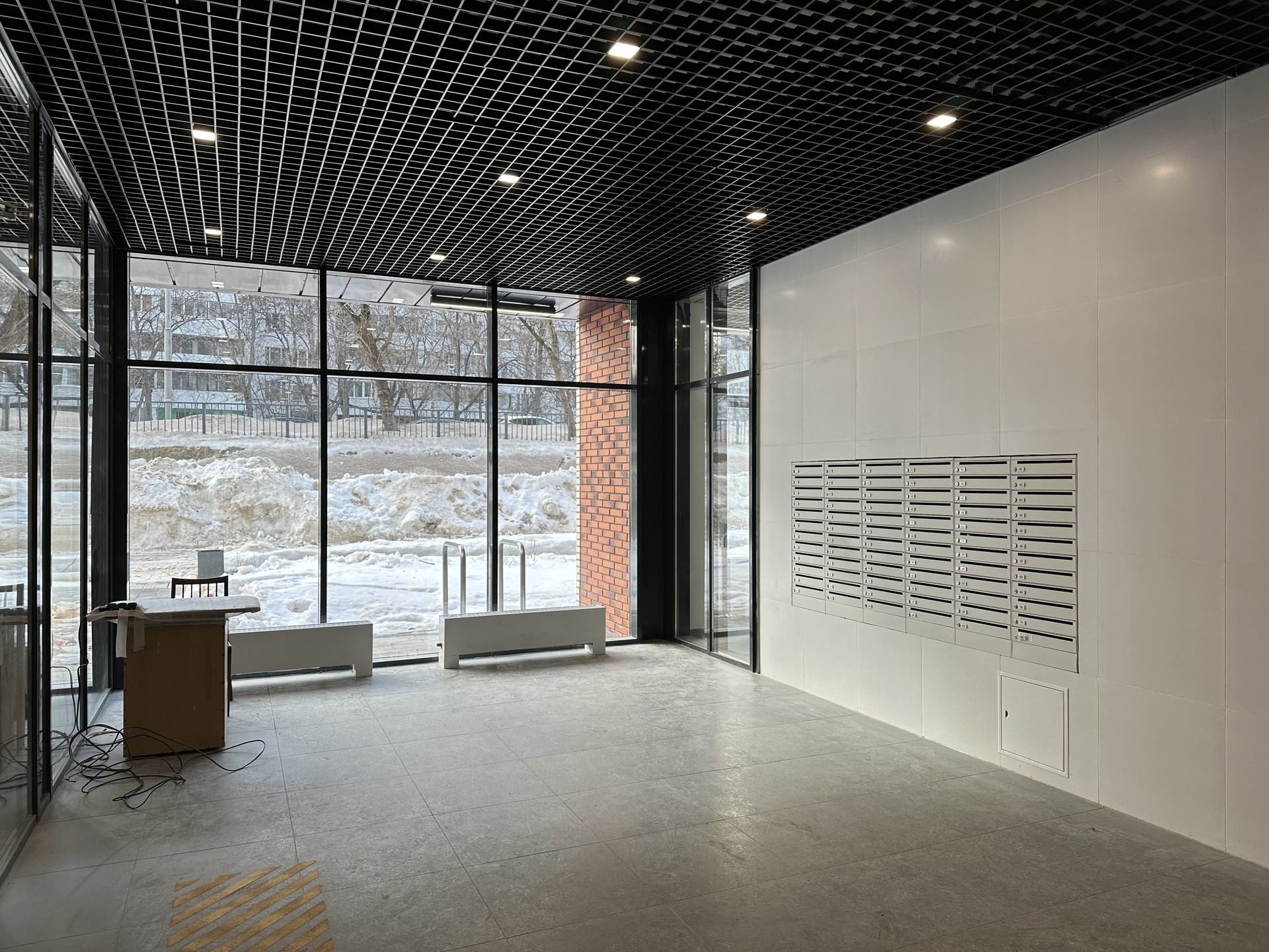 Просторный светлый подъезд с двумя выходами. Колясочная. Витражное остекление.