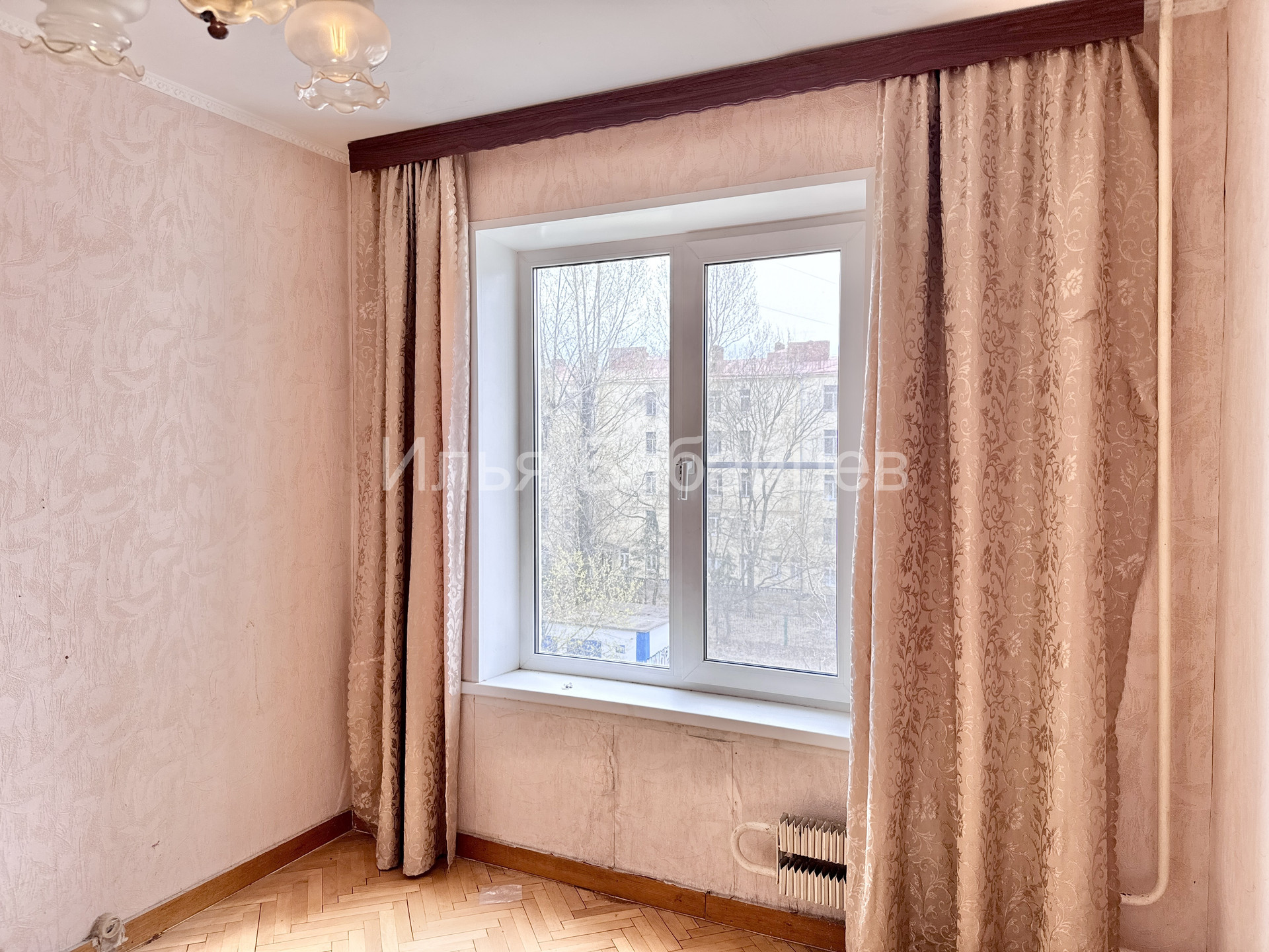 Из большой спальни есть выход на просторную лоджию, окна выходят на тихий зеленый двор.