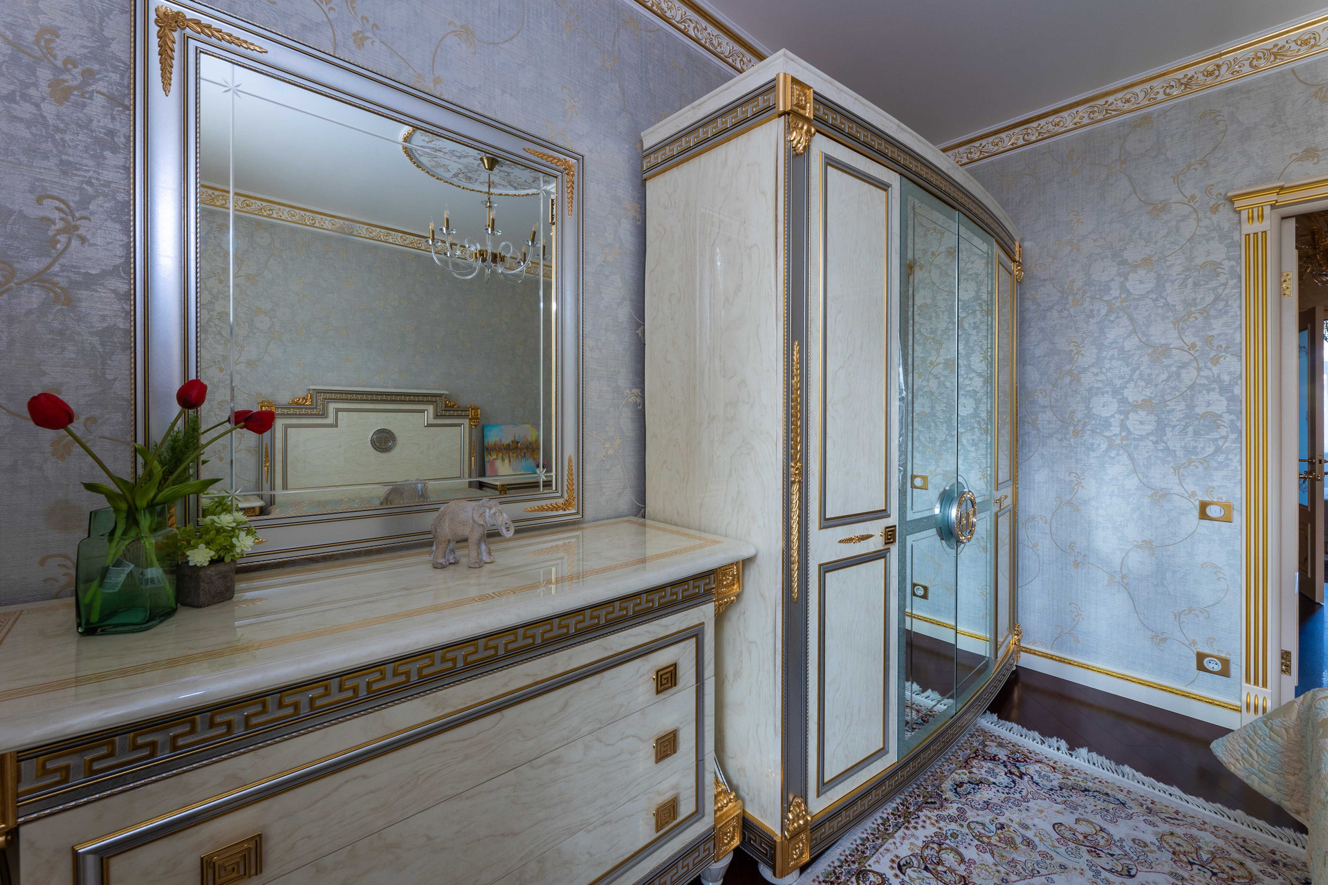 Выполнен авторский ремонт в классическом стиле, украшенный люстрами и золотыми светильниками. Интерьеры наполнены всей необходимой мебелью, сделанной на заказ, и бытовой техникой премиального качества. В квартире очень тихо.