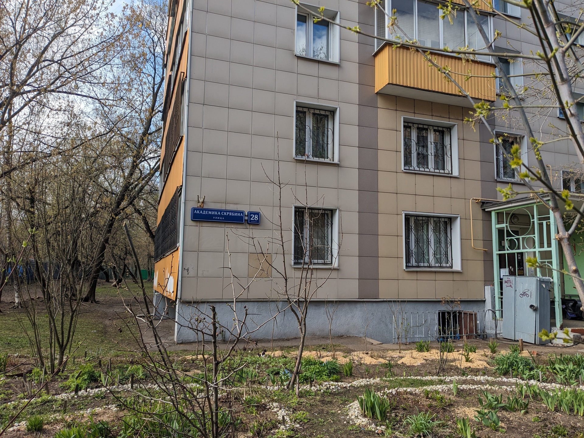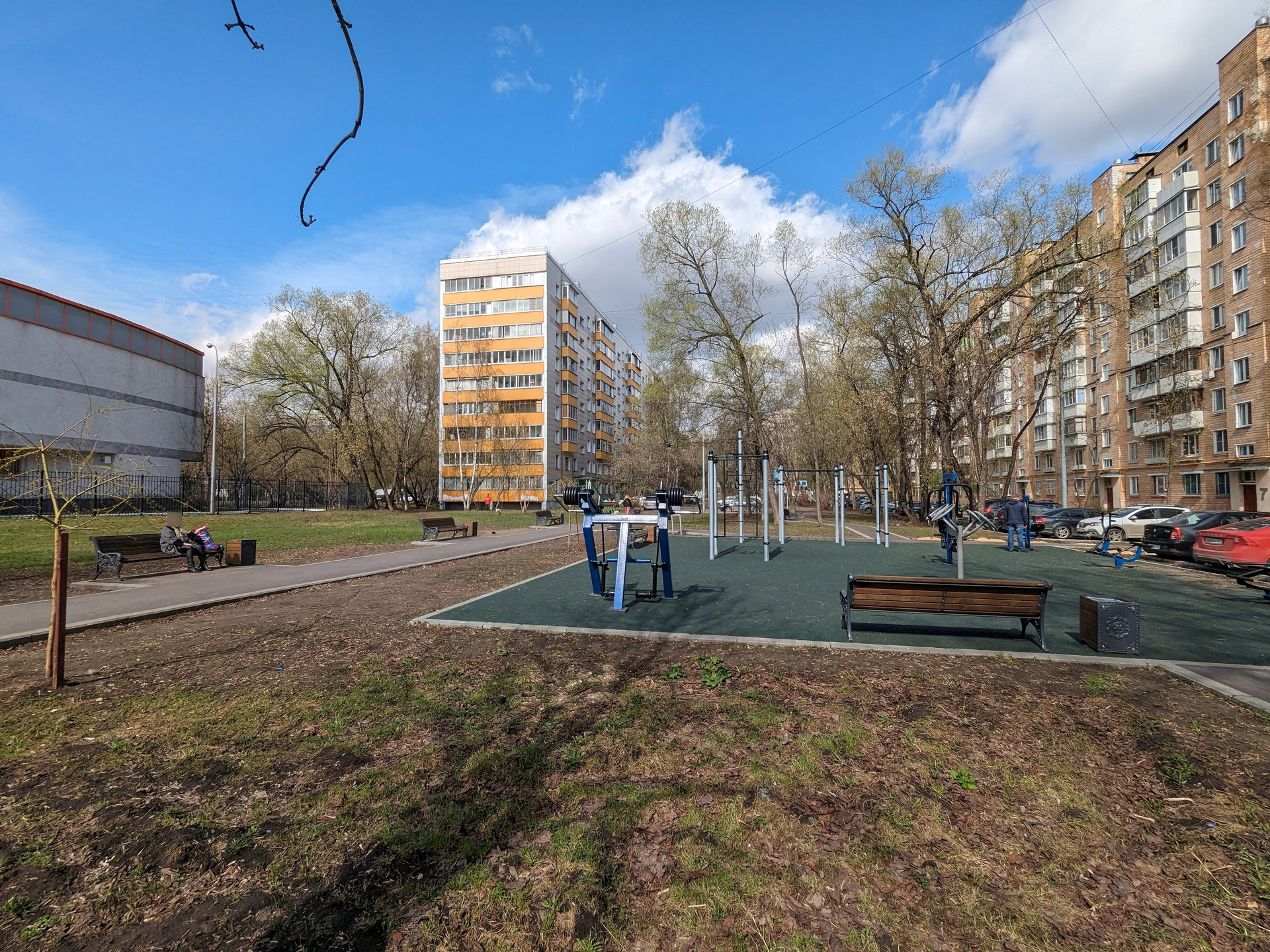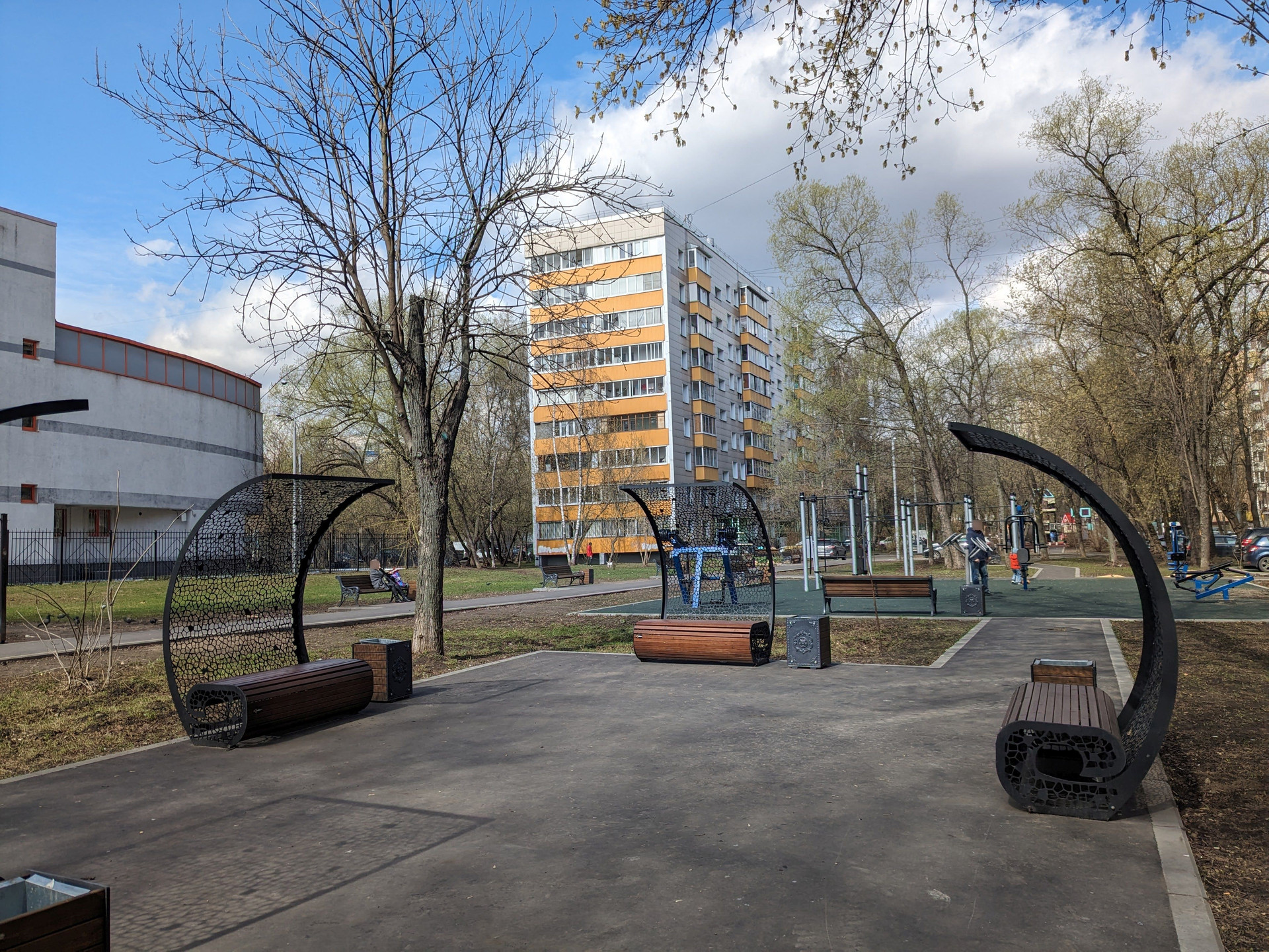 Напротив дома находятся детская площадка, тренажеры, турники, зона отдыха, высажены деревья.