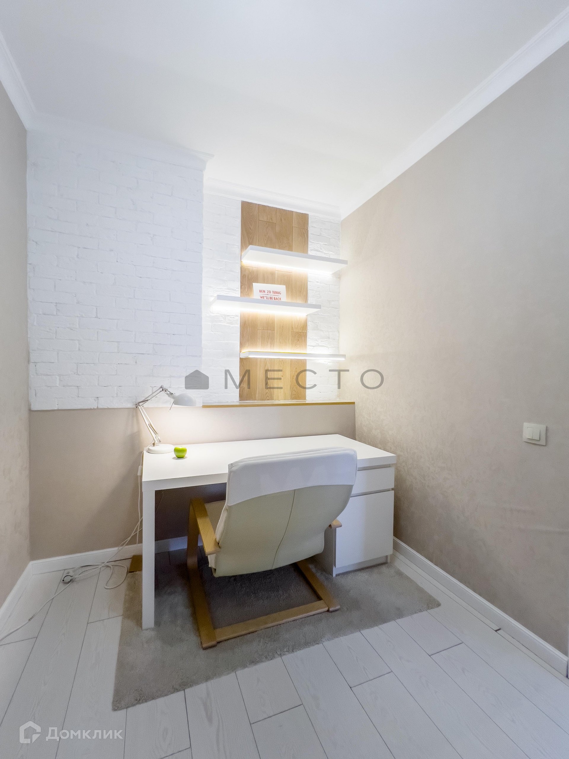 В апартаменте изолированная спальня 16 м2 с видом во двор, кухня-гостиная 15 м2, в которой гармонично располагается зона приготовления пищи, обеденная зона и место для отдыха. Также, есть кабинет для работы 3,6 м2. В данной комнате также можно сделать комнату для ребенка, куда войдет полноценная кровать, библиотеку, либо чилаут зону. Очень просторный санузел. 5,8м2