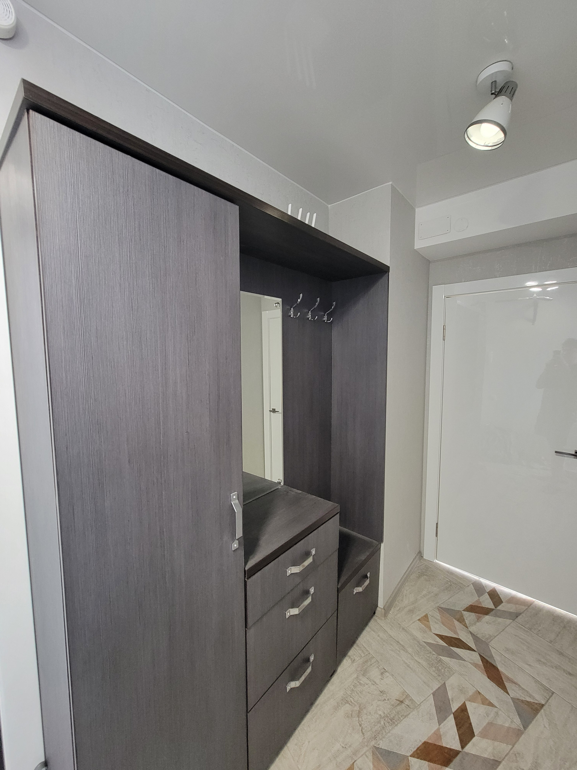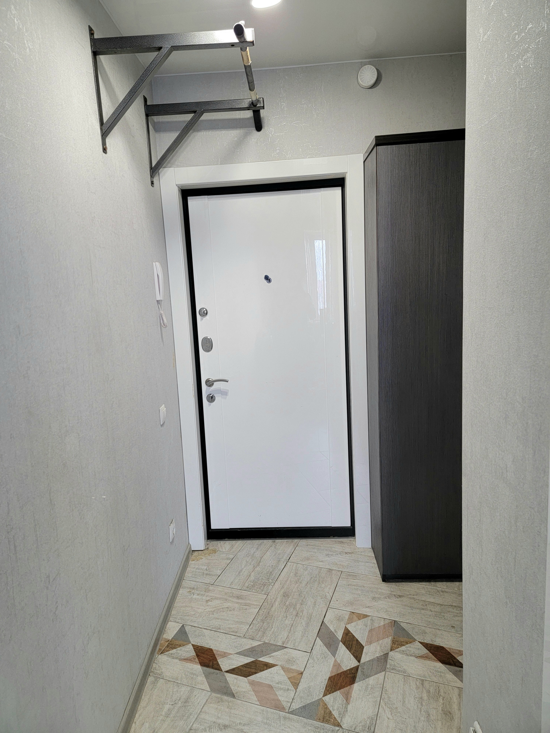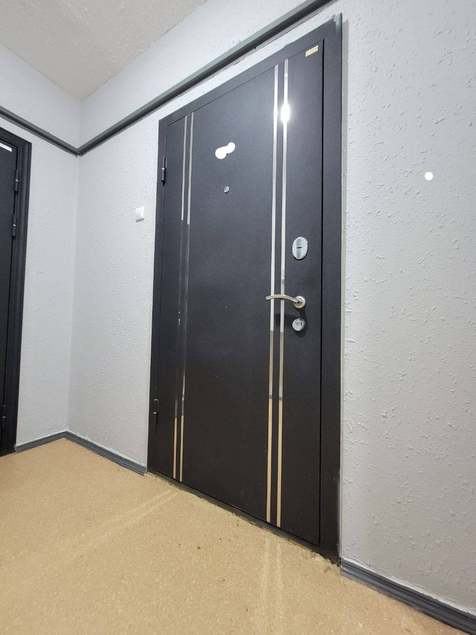 На полу в коридоре керамогранит, ламинат 33 класса, натяжные потолки, обои, кафель в санузле, межкомнатные двери фирмы Profil Doors, входная дверь с шумоизоляцией.