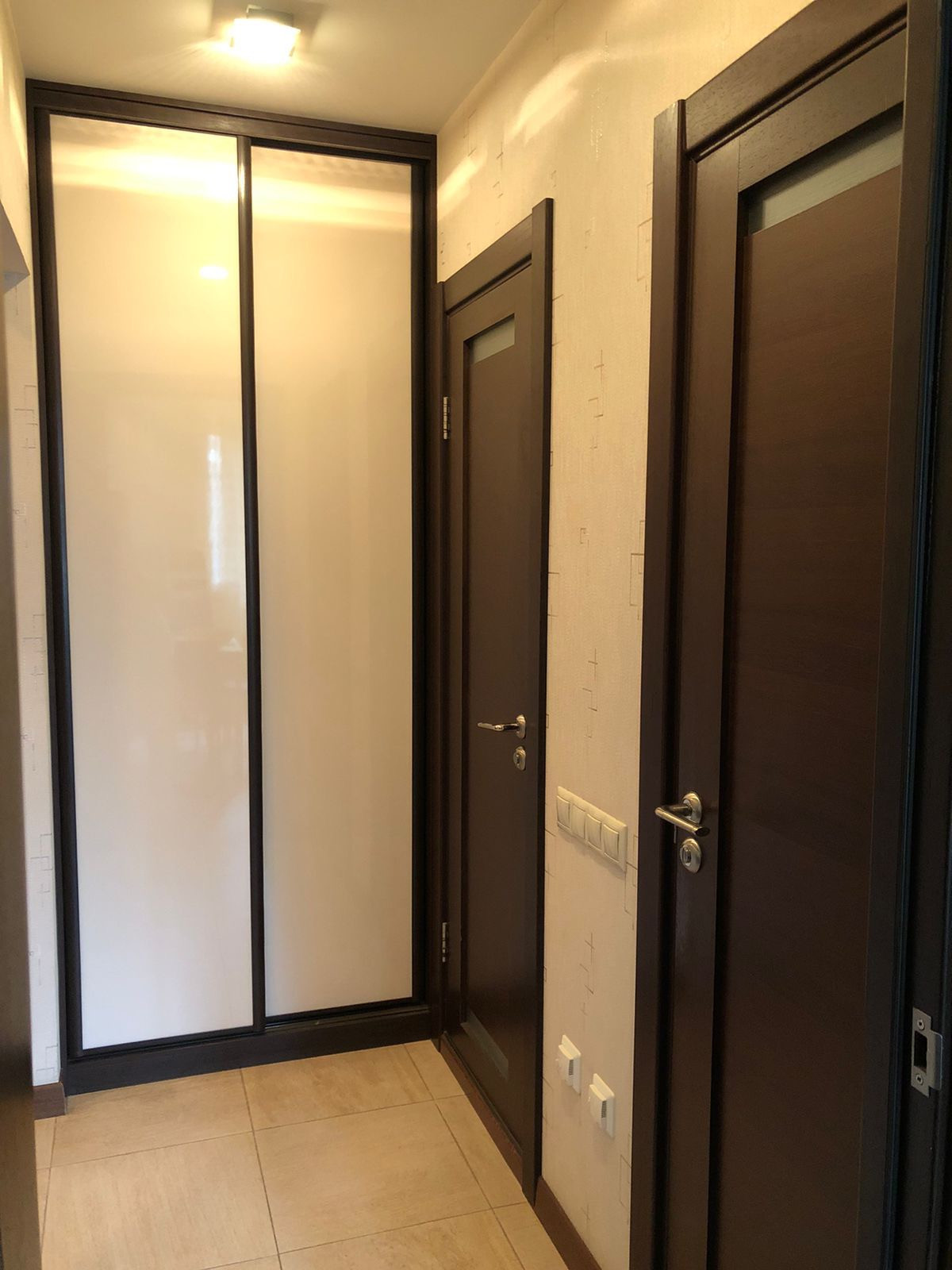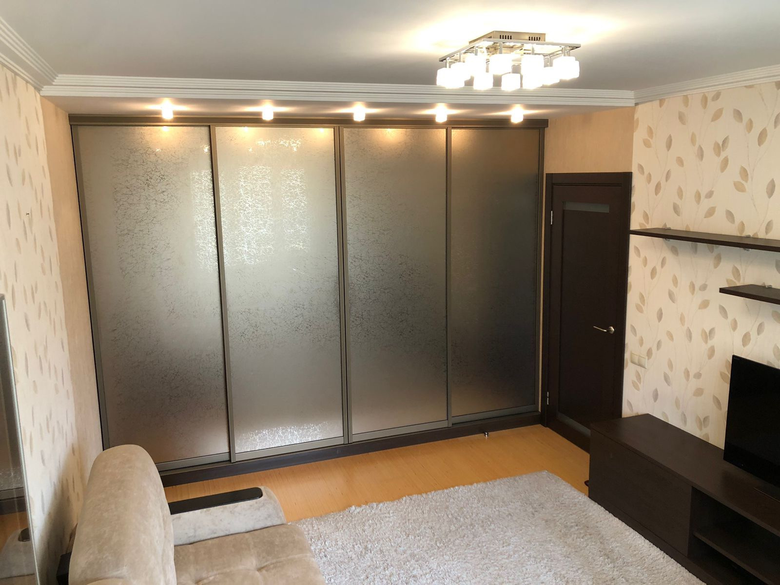 -натуральный шпон, пластик и стекло. Встроенные шкафы в коридоре и комнате.В туалете установлен дополнительно водонагреватель на время отключения ГВС. На кухне и коридоре теплый пол.