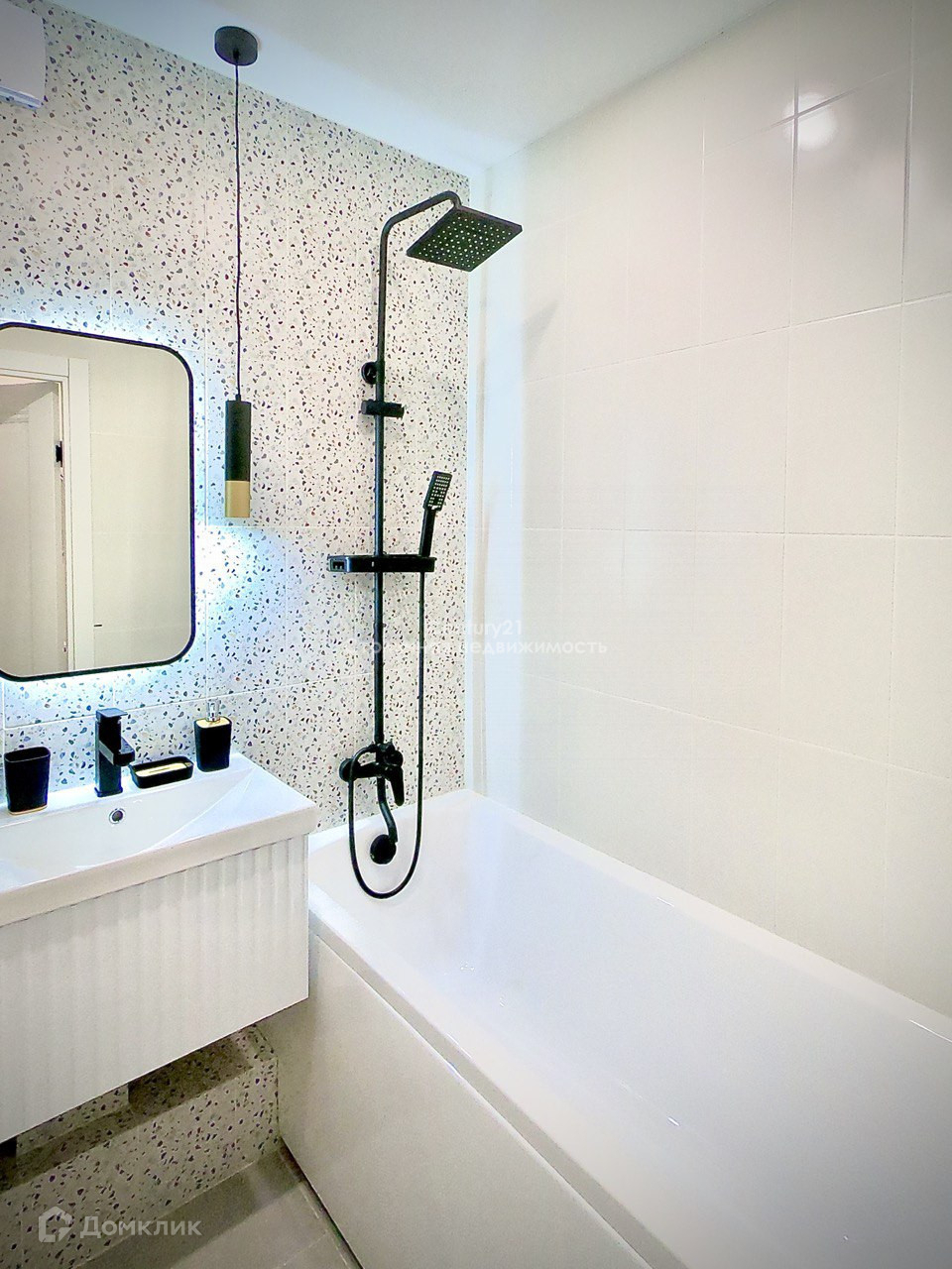 Санузел: акриловая ванна, душевая стойка с 2 лейками, сенсорное зеркало, смеситель с индикатором температуры воды и раковина с тумбой с ящиками, гигиенический душ, полотенцесушитель и новая стиральная машина.