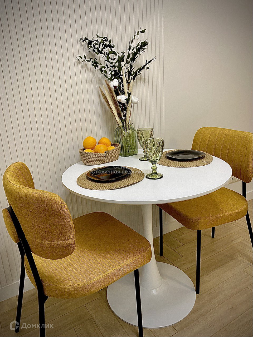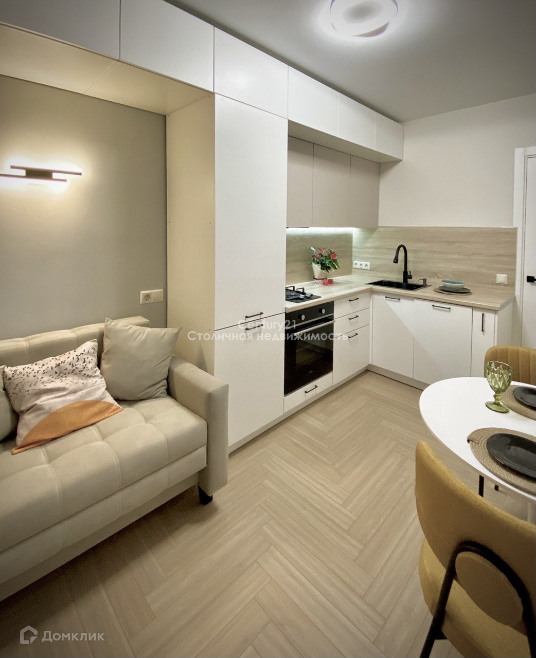 Кухня-гостиная 10 кв.м: современный кухонный гарнитур в потолок (много места для хранения + закрытые полки), посудомоечная машина, духовая печь, нержавеющая раковина со встроенным дозатором для мыла, компактная газовая плита. Уютный диванчик, круглый стол+2 стула-кресла - место с розетками для TV и мультимедиа.