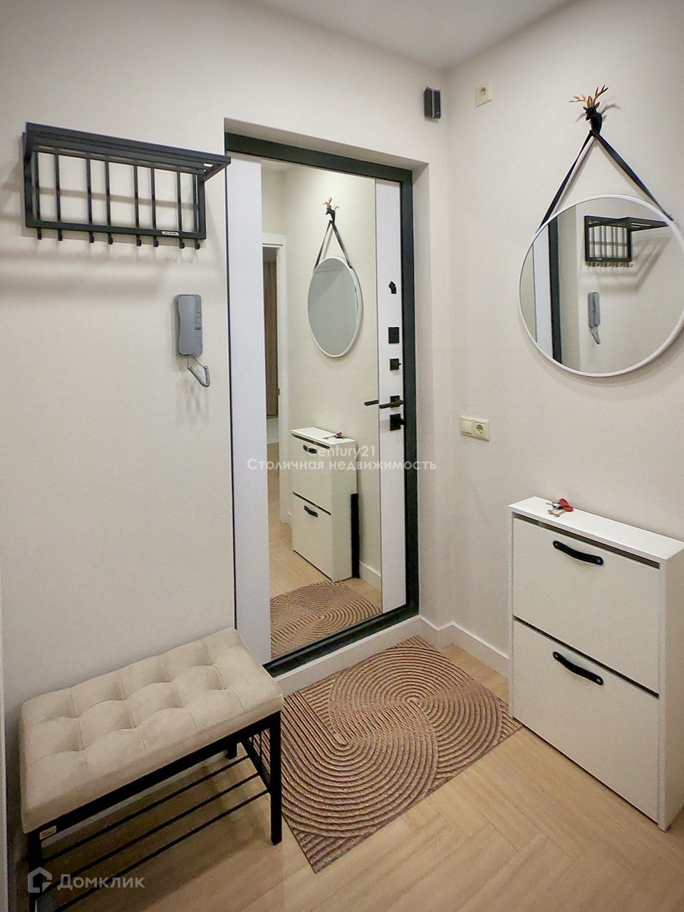 Прихожая: обувница, зеркало, вешалка и пуф.