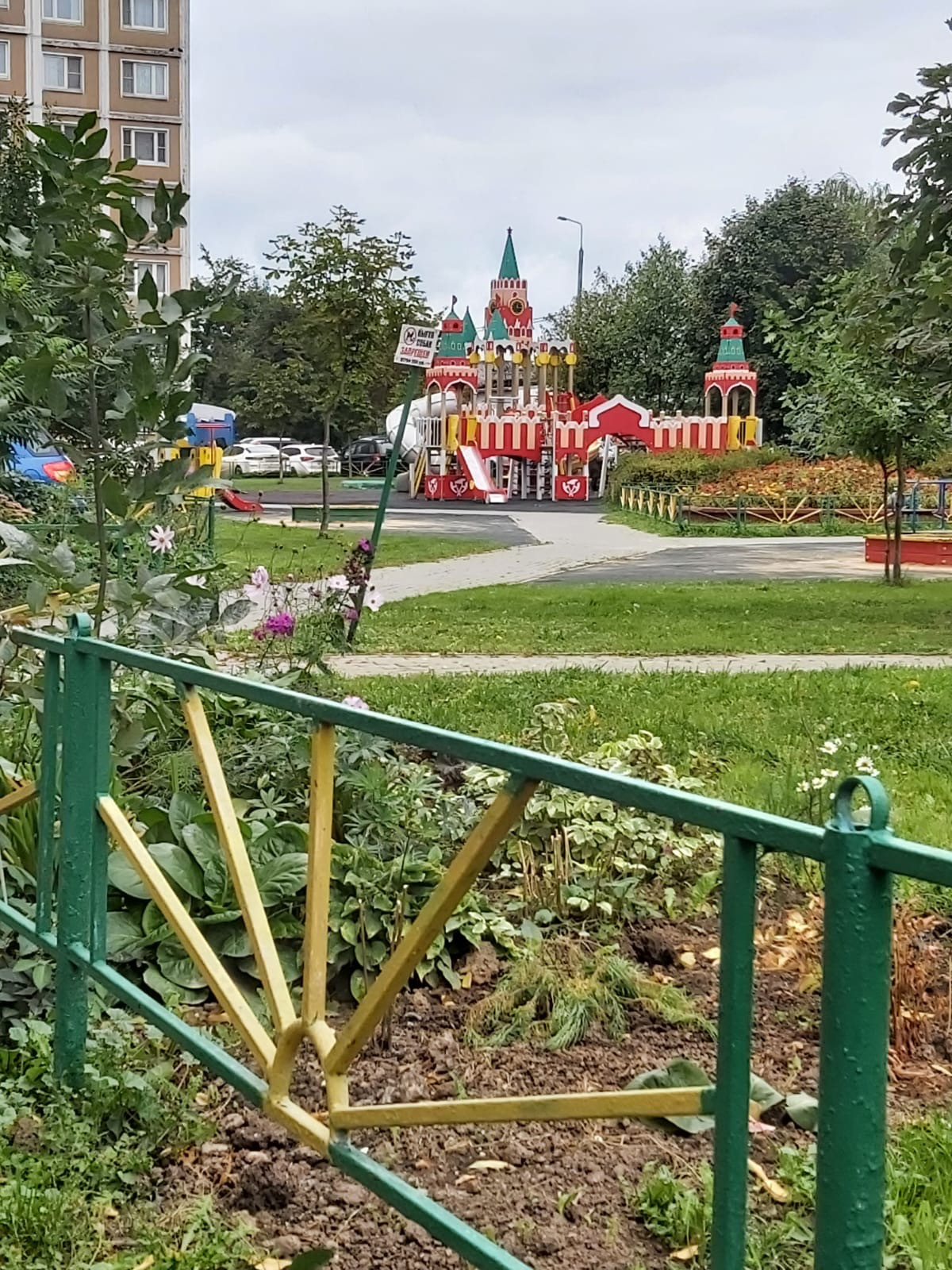 Во дворе современная детская площадка.