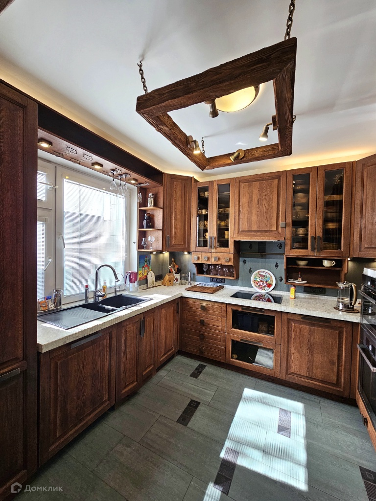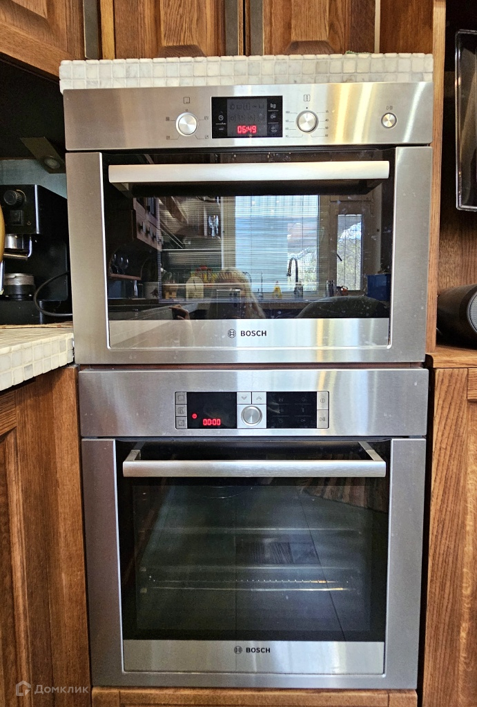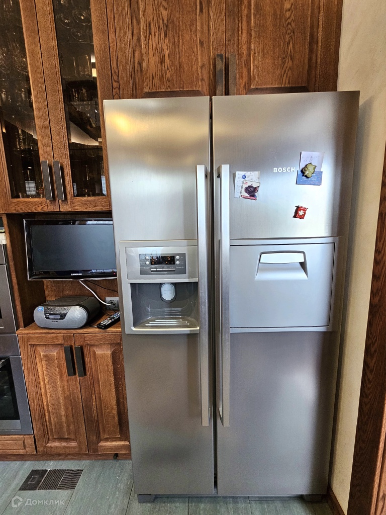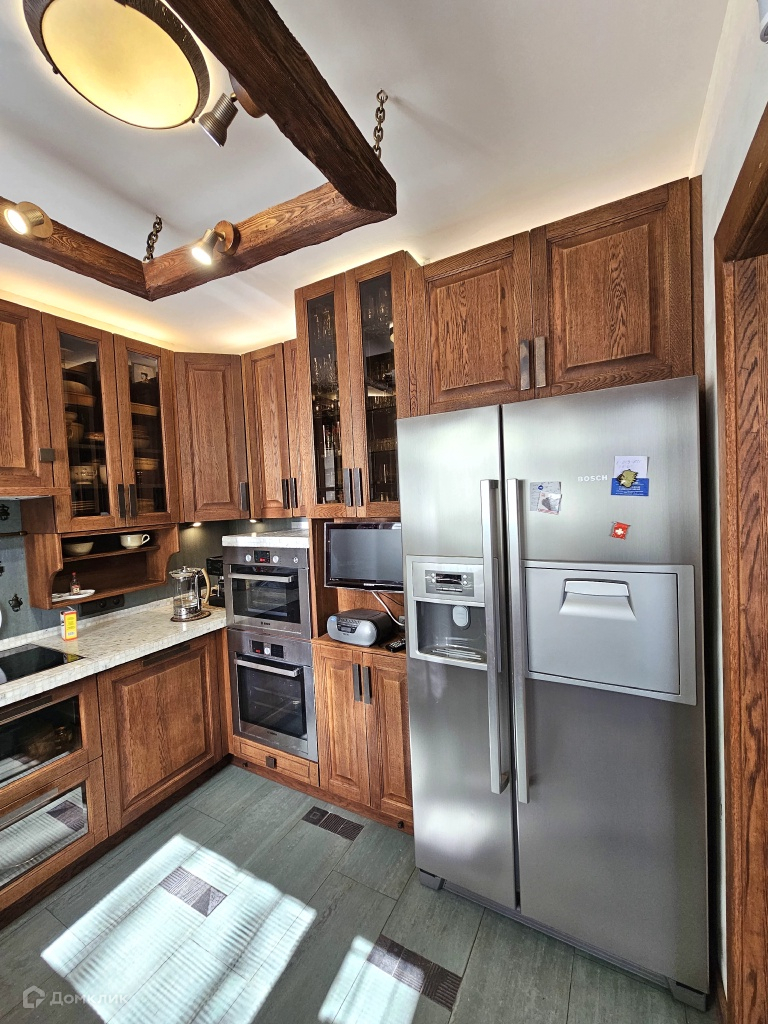 Просторная кухня оборудована кухонной мебелью со встроенной бытовой техникой Bosch, измельчителем пищевых отходов.