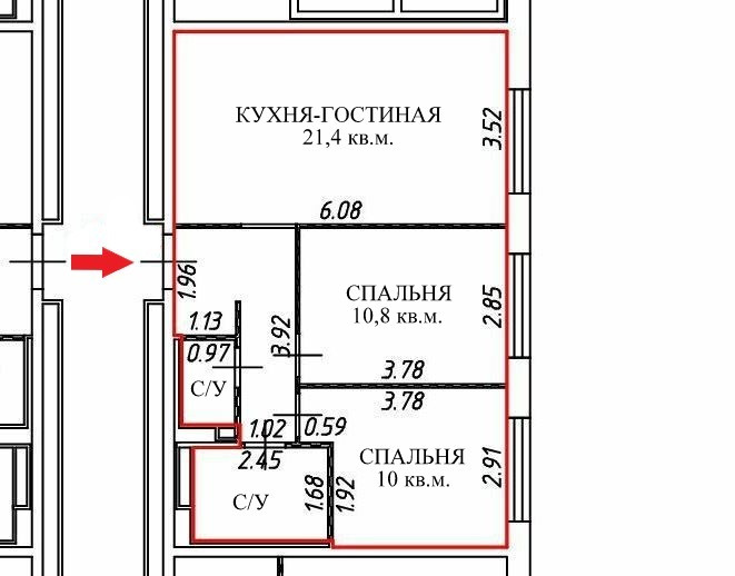 Площадь кухни 21.4 м2