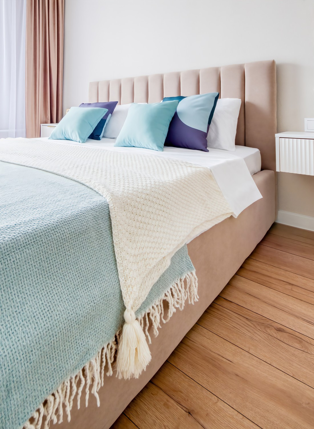 - уютная спальня с шикарной кроватью с подъёмным механизмом и коробом для хранения вещей;