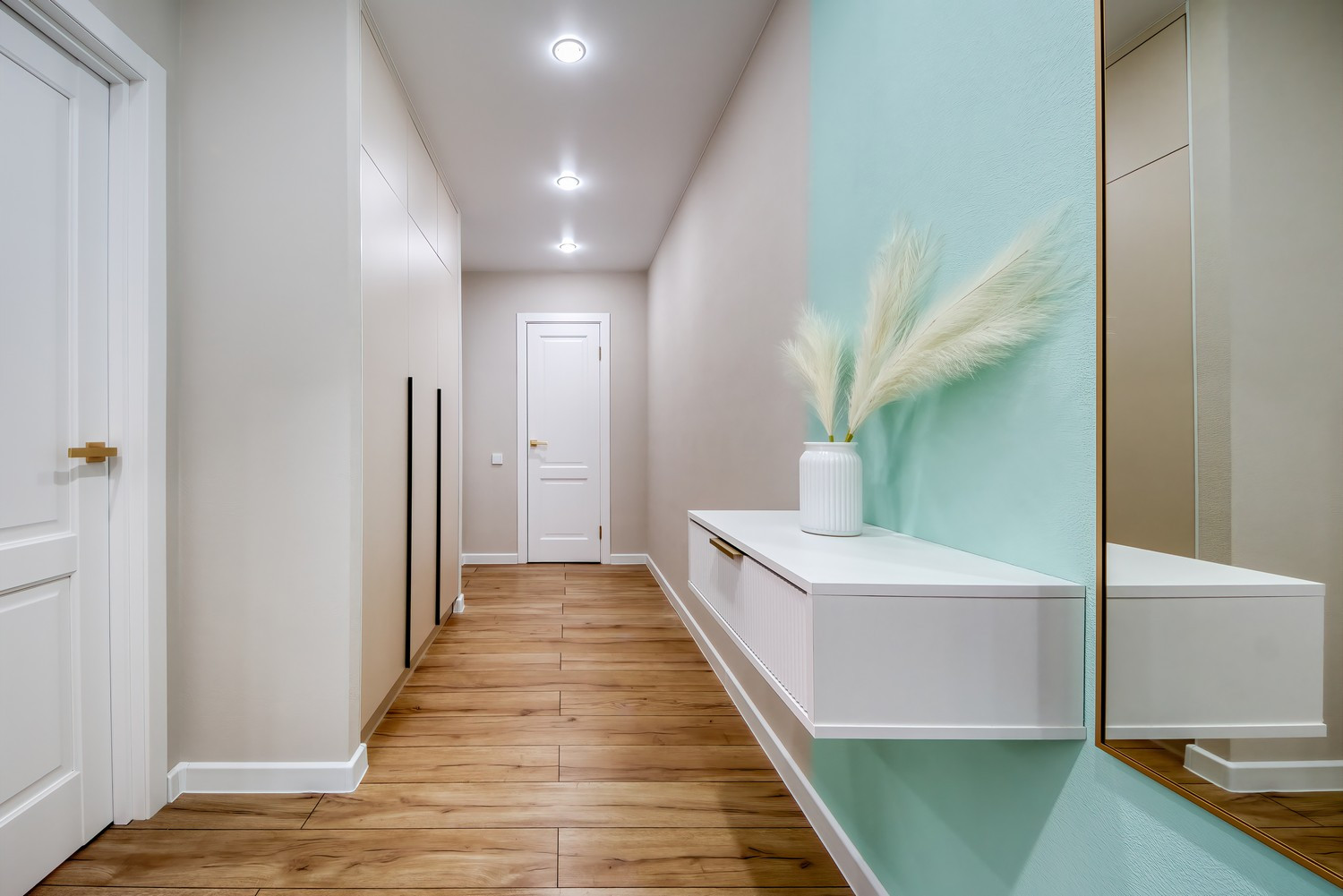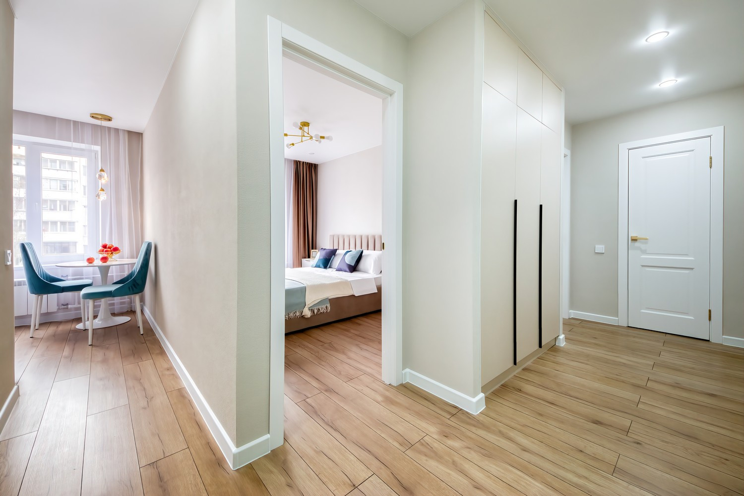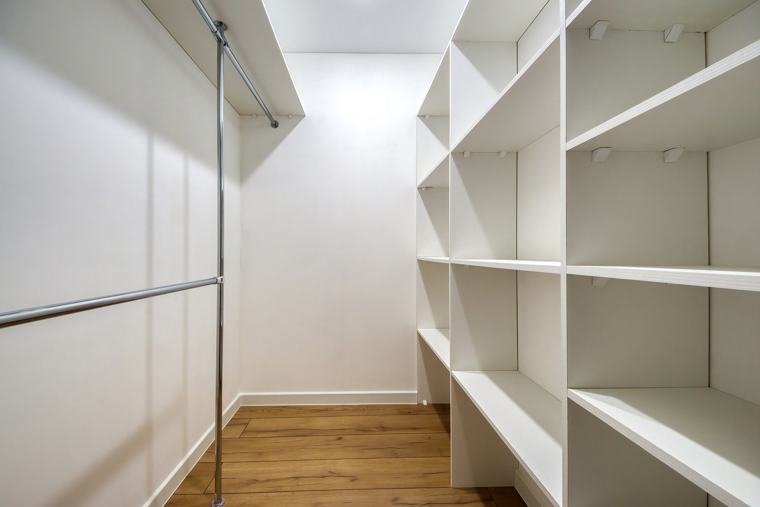 В квартире много мест для хранения: полноценная гардеробная, огромный встроенный шкаф и просторный застеклённый балкон.