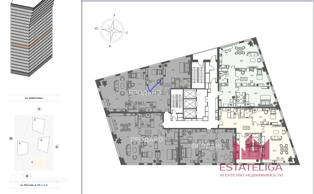 4-комнатная квартира, 140 м2, этаж 8 / 22, на продажу в Москве, Мытная улица, 40к1