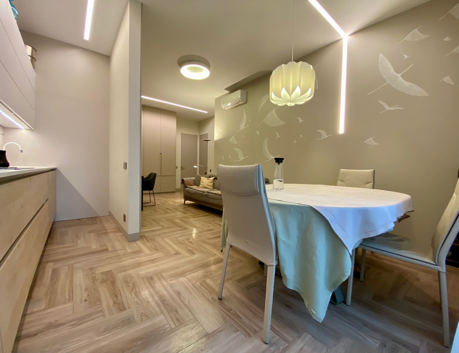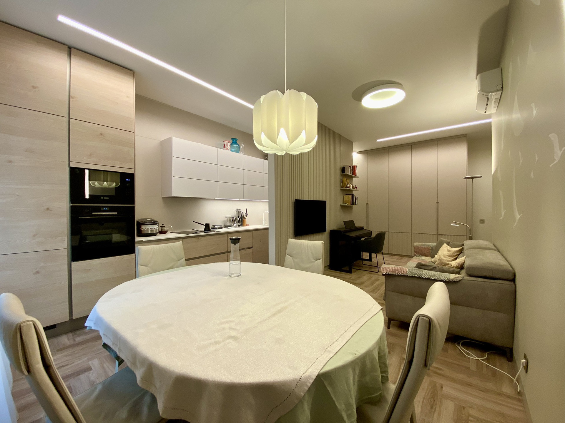 При ремонте использовались натуральные материалы. Гостиная зона с кухней Nolte.