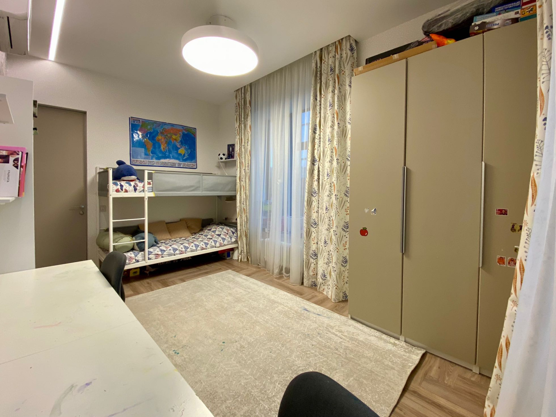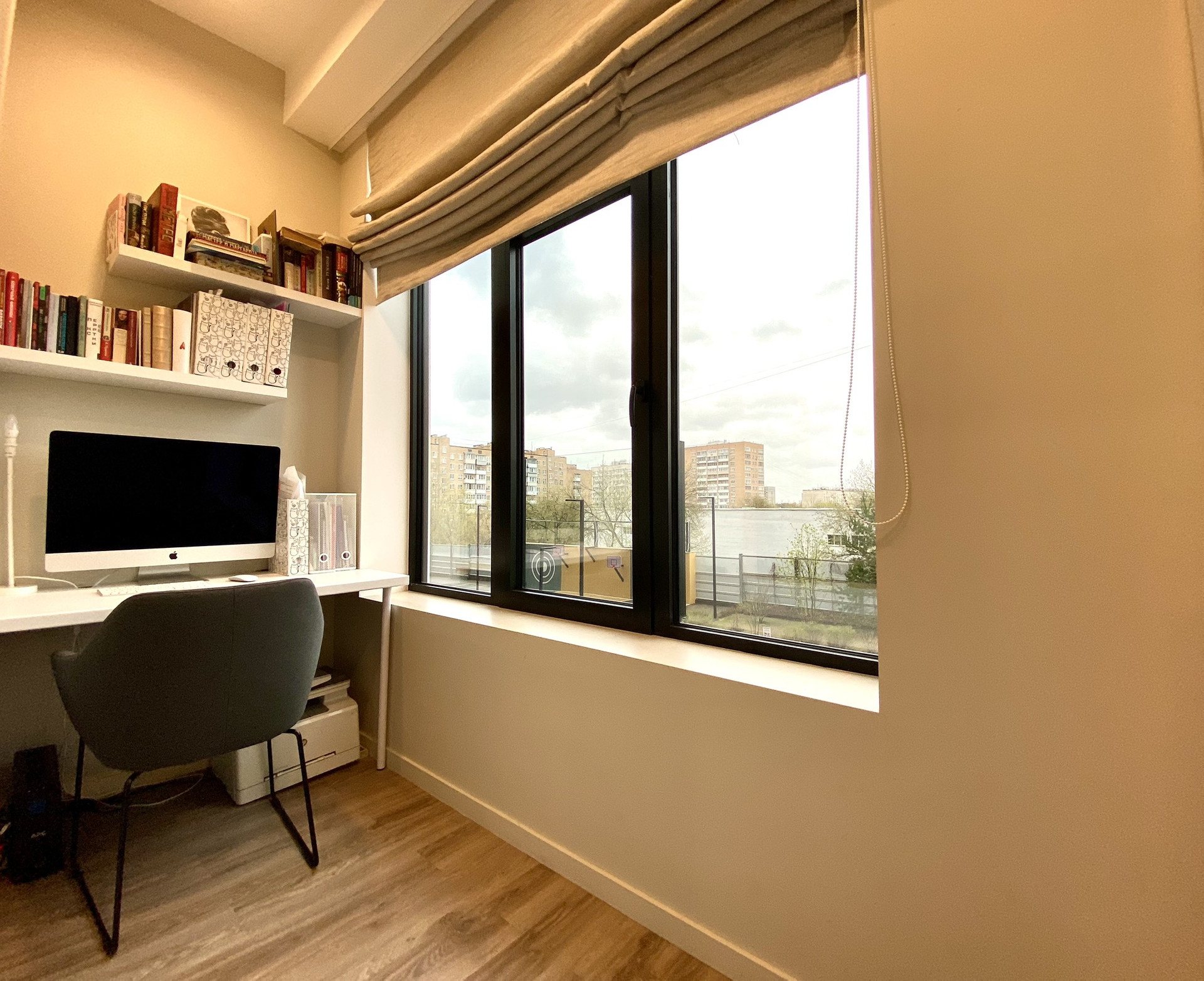 На лоджии располагается рабочее место, она утеплена, заменены стеклопакеты(по согласованию с застройщиком) на более теплые.