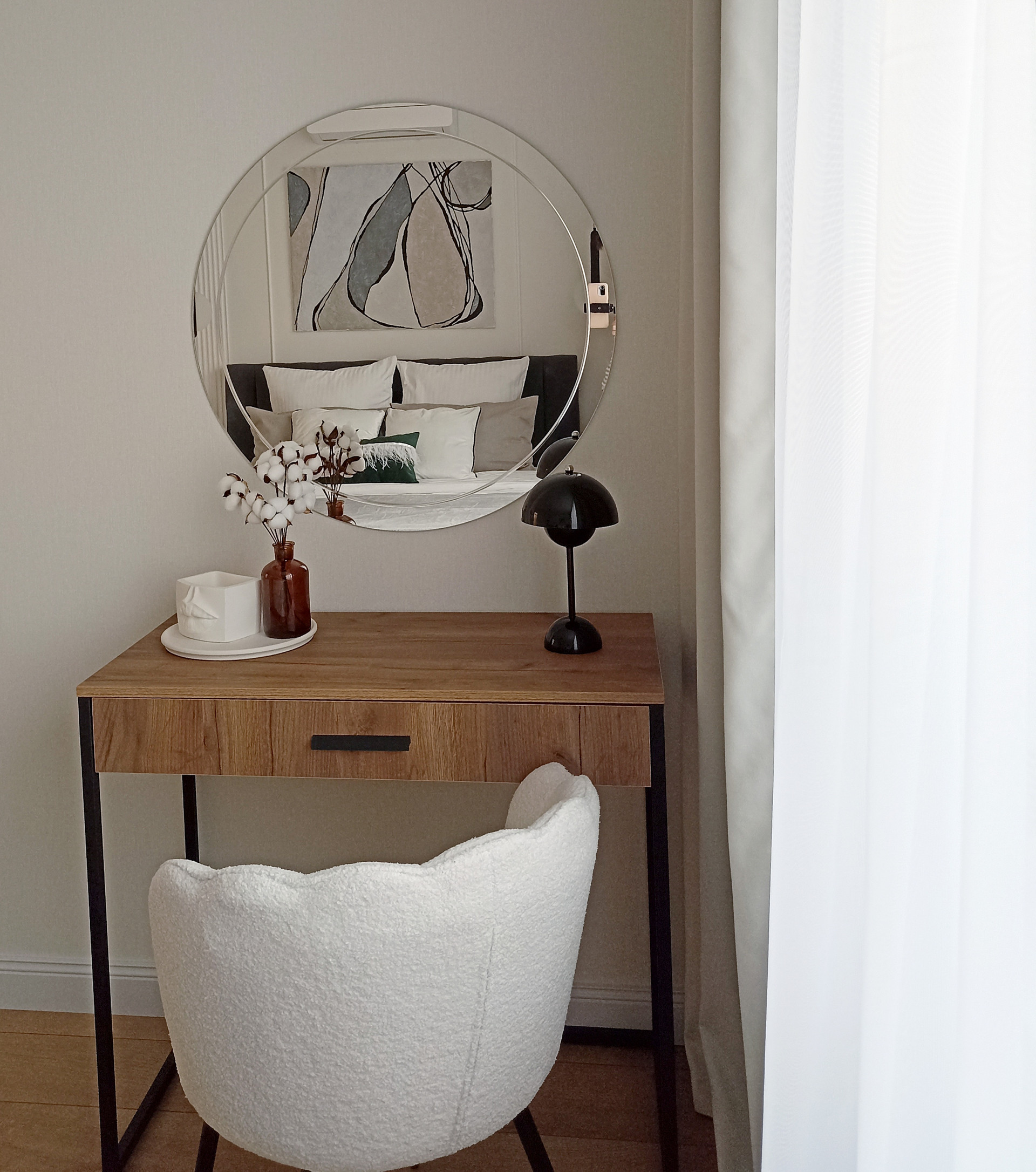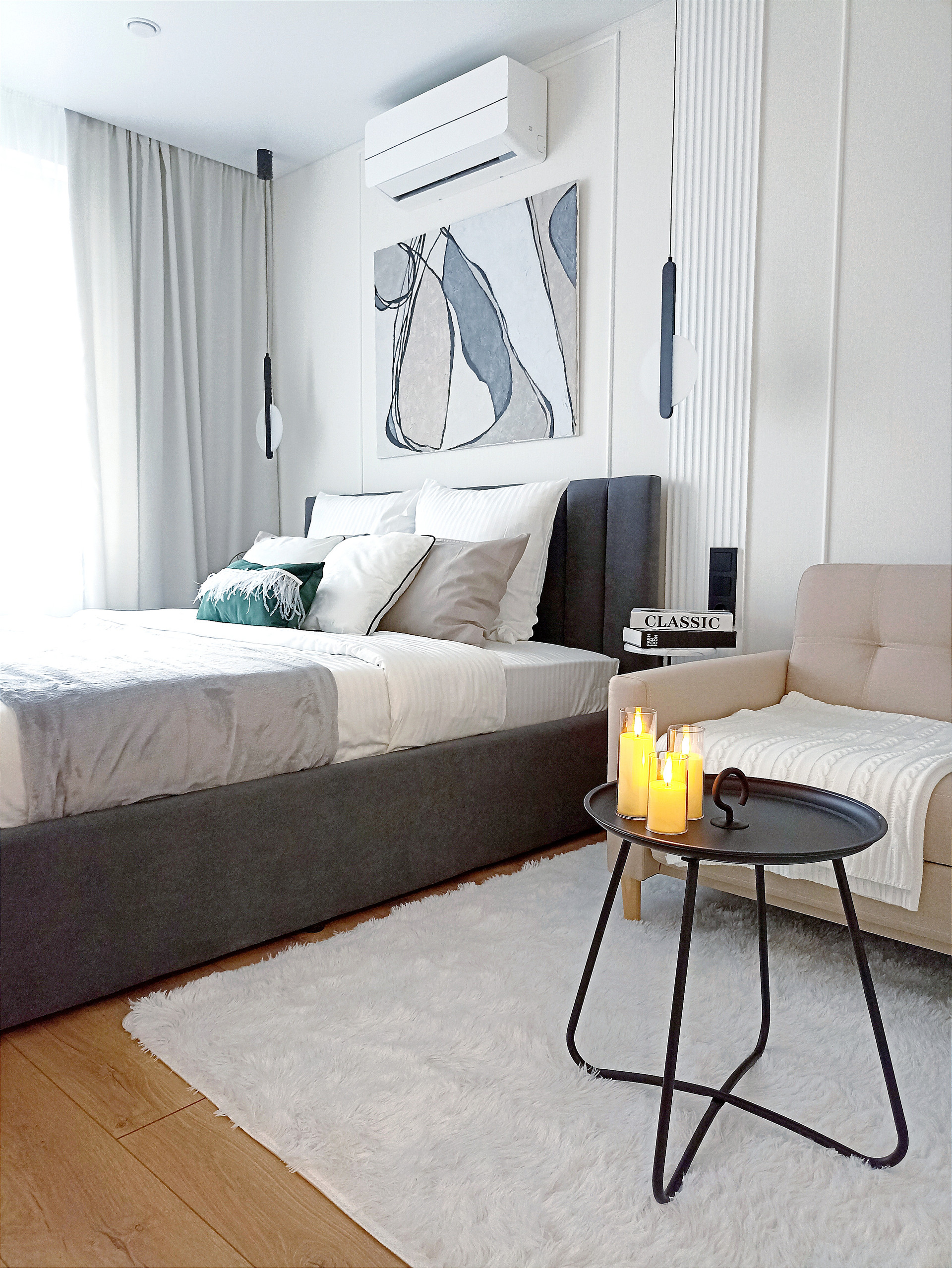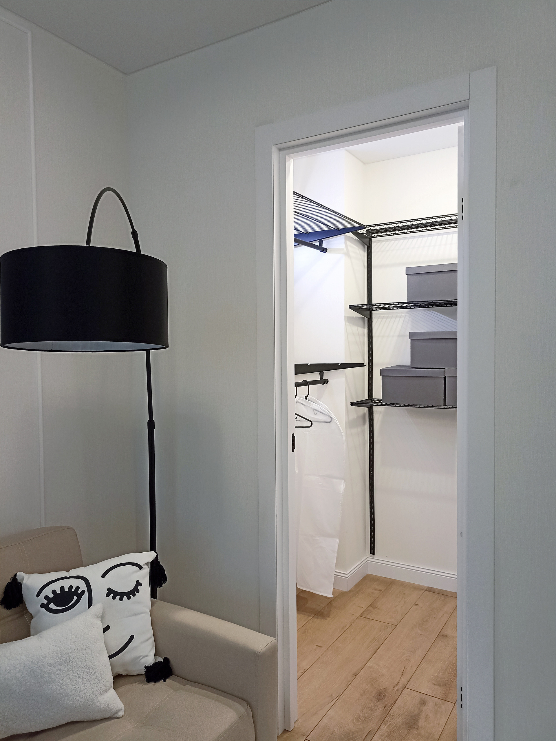 Просторная комната 20 кв.м. с двуспальной кроватью (кровать 200 на 160 см) с подъемным механизмом (позволяющим использовать пространство под ней в качестве дополнительной зоны хранения) и полноценной гардеробной комнатой. Дополнительными элементы для гардеробной легко можно докупить в Леруа Мерлен. Комната укомплектована  раскладывающимся диваном и ТВ зоной. Предусмотрена макияжная зона/рабочее место.