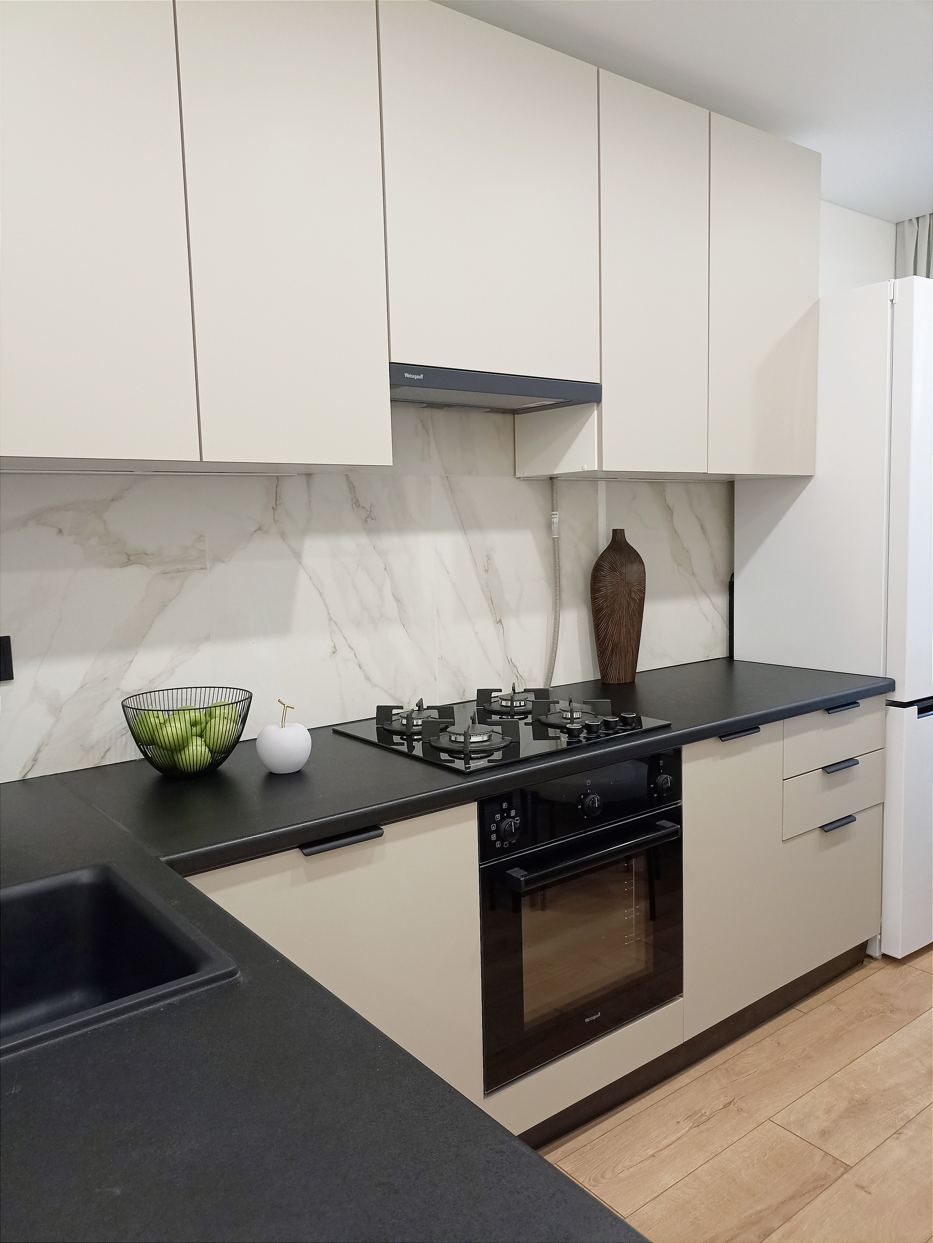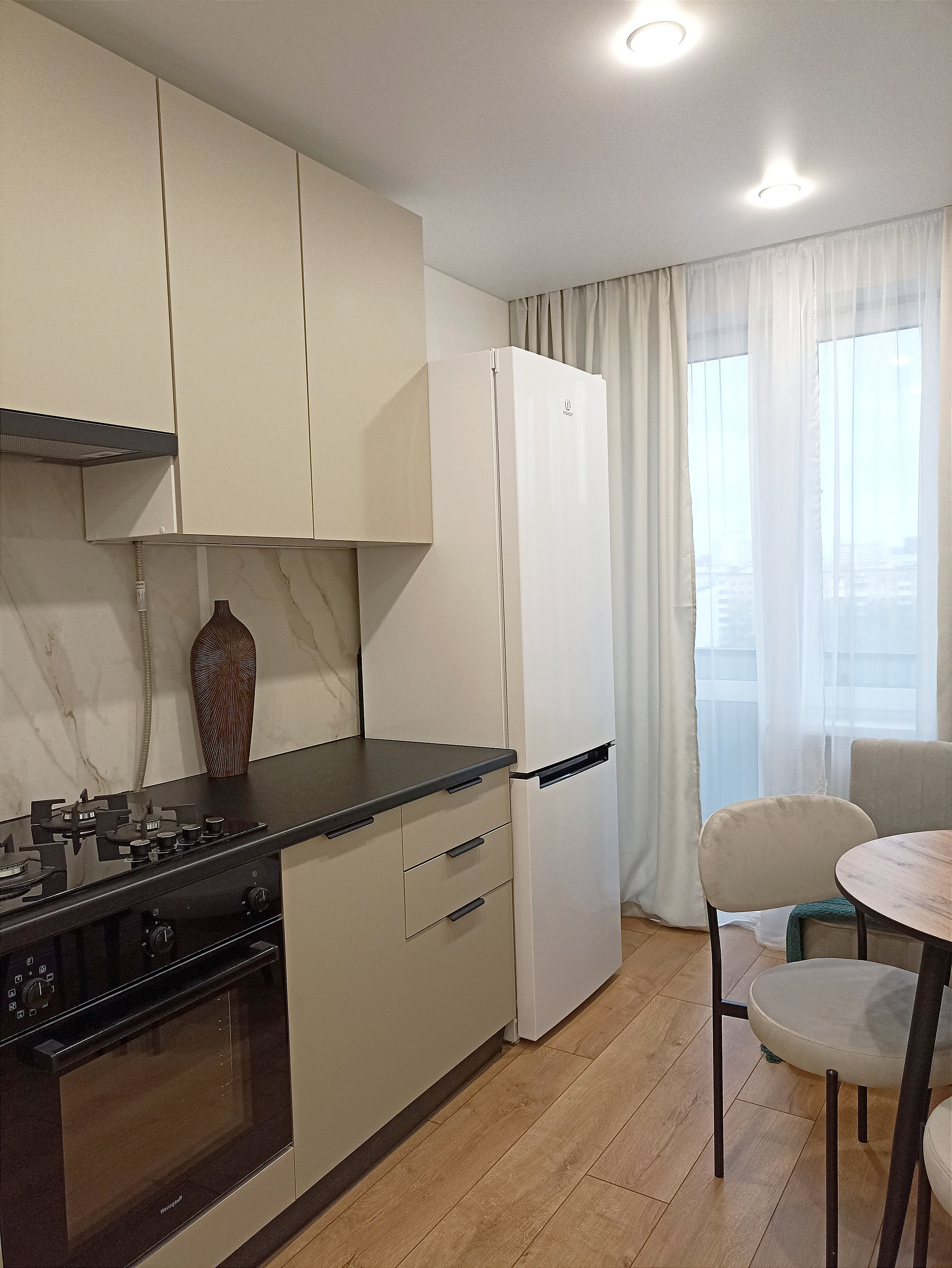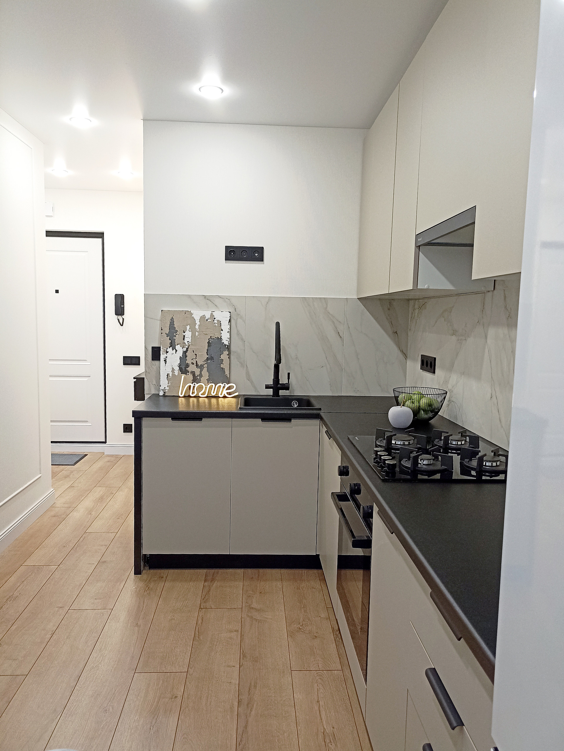 Уютная кухня 9.8 кв.м укомплектована все необходимой техникой: холодильником, варочной панелью, духовым шкафом, вытяжкой, посудомоечной машиной. Смеситель 2в1 совмещенный с системой под фильтрованную воду.