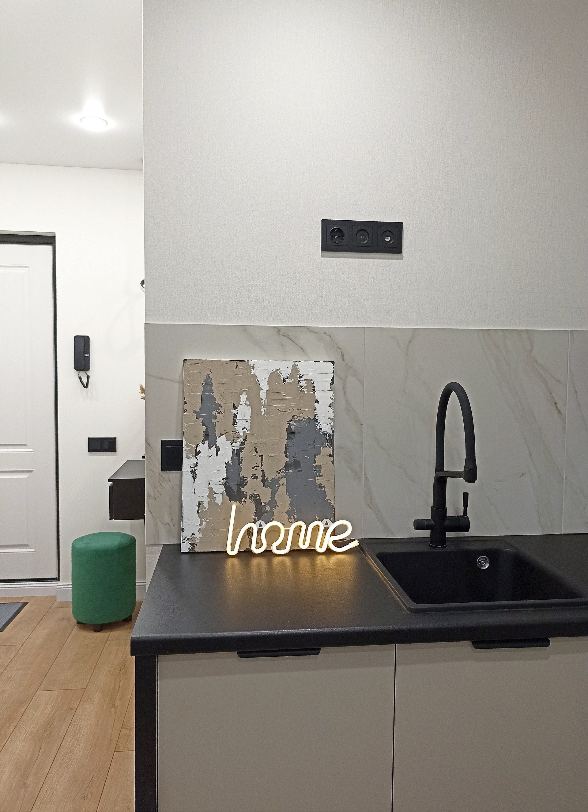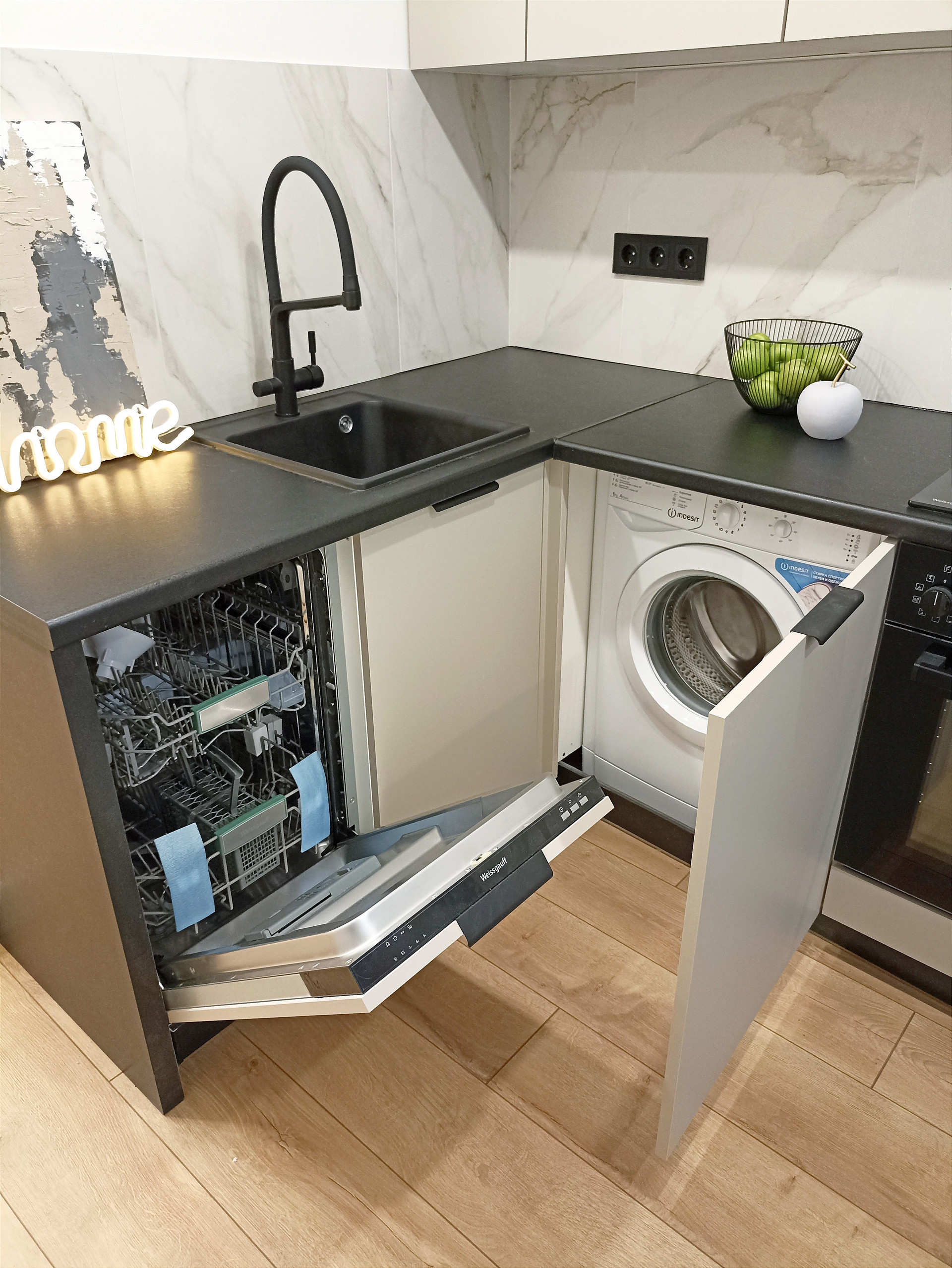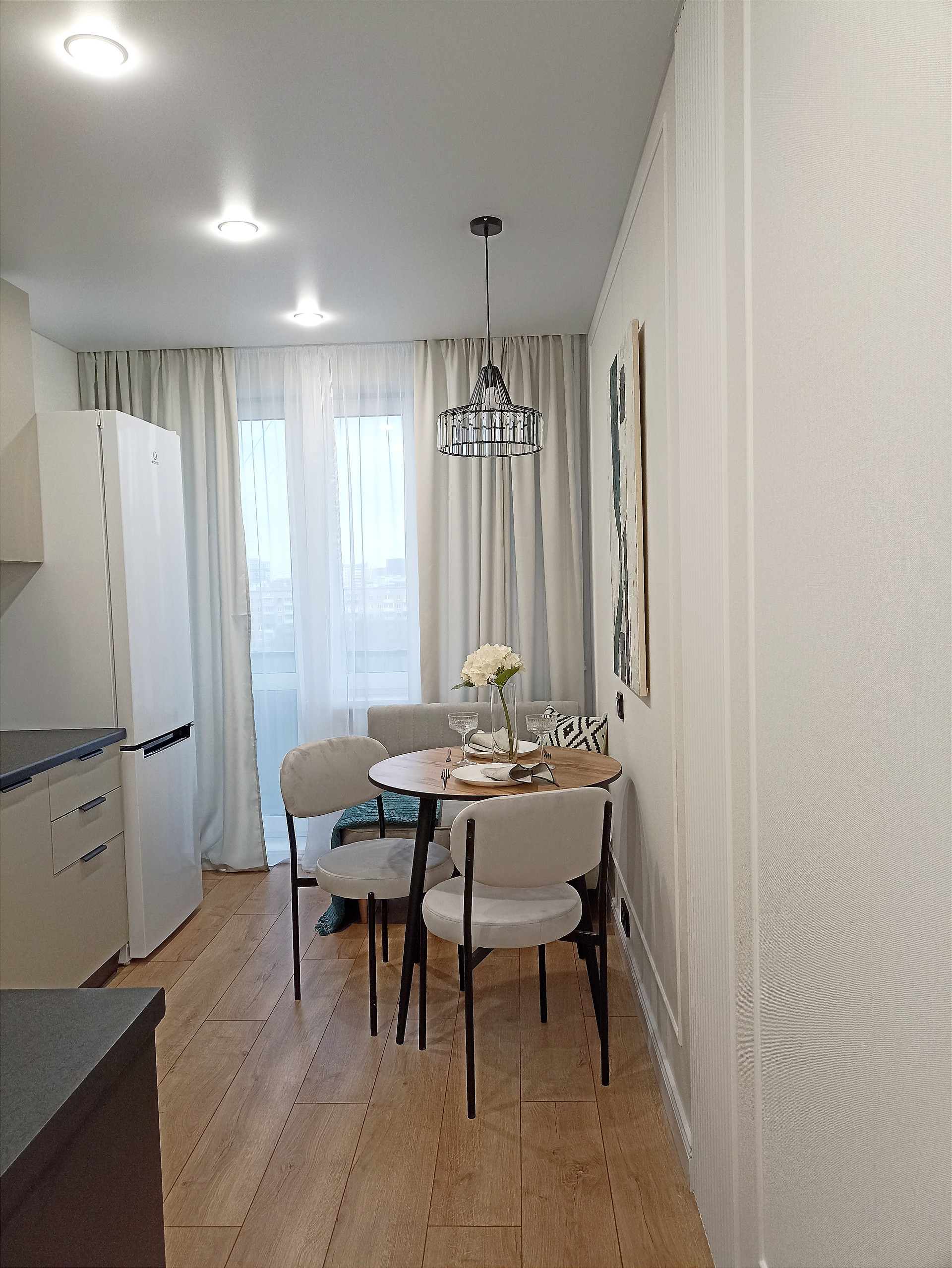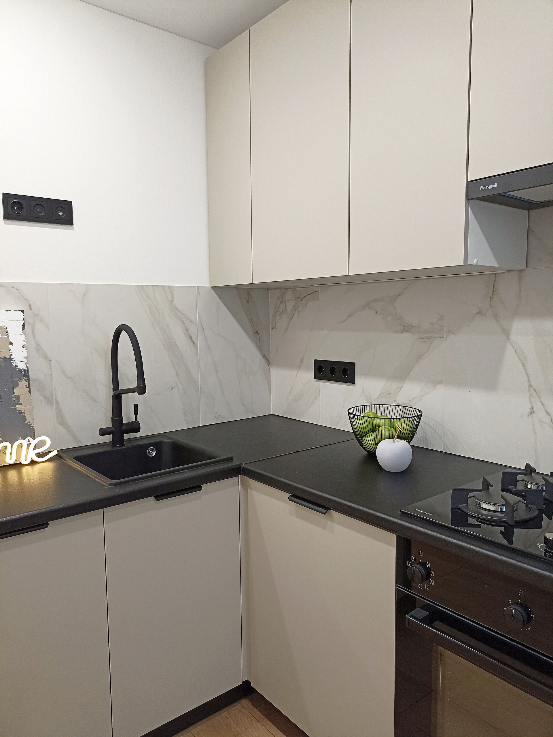Уютная кухня 9.8 кв.м укомплектована все необходимой техникой: холодильником, варочной панелью, духовым шкафом, вытяжкой, посудомоечной машиной. Смеситель 2в1 совмещенный с системой под фильтрованную воду.