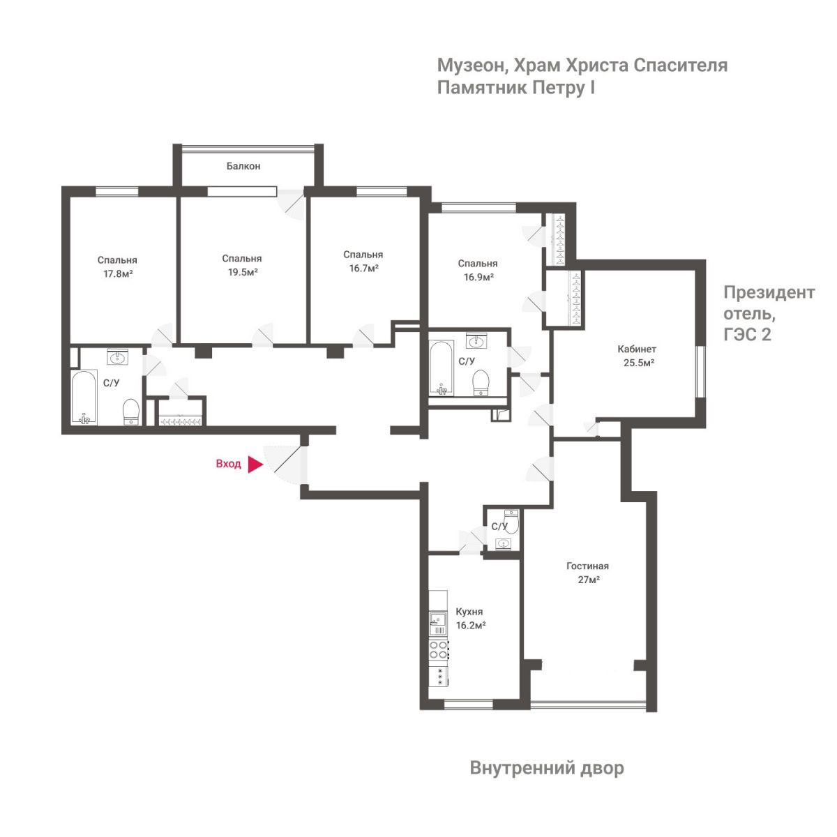 Дом имеет закрытый внутренний двор с детской площадкой. Уникальная локация дает возможность находиться вблизи излюбленных прогулочных зон, достопримечательностей, ресторанов и кафе, имеет замечательную транспортную доступность.