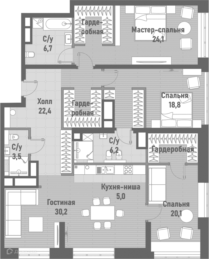 Жилая площадь 93,2 м2 (мастер-спальня 24,1 , спальни 18,8 + 20,1)