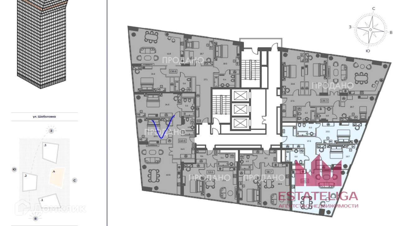 3-комнатная квартира, 111 м2, этаж 25 / 25, на продажу в Москве, Мытная улица, 40к4