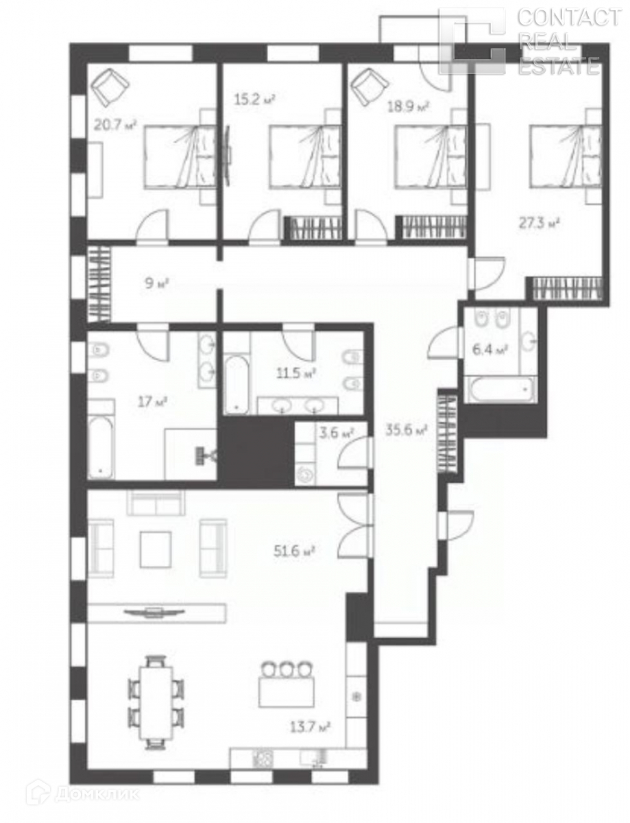 Прекрасная просторная квартира с 4 спальнями отличного подходит для комфортной жизни в центре города. Планировка предусматривает: просторную кухню-гостиную; четыре отдельные комнаты, в которых можно расположить спальни, кабинет, детскую или спортзал; четыре санузла; гардеробные и холл. В одной из комнат расположен выход на открытый балкон с видами в сторону уютного внутреннего двора и сада.
