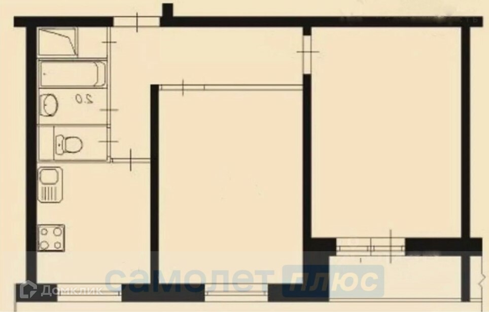 Удобная двухкомнатная квартира с раздельными комнатами, кухней и санузлом.