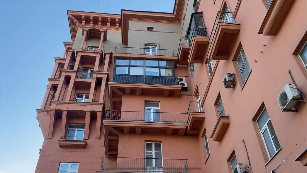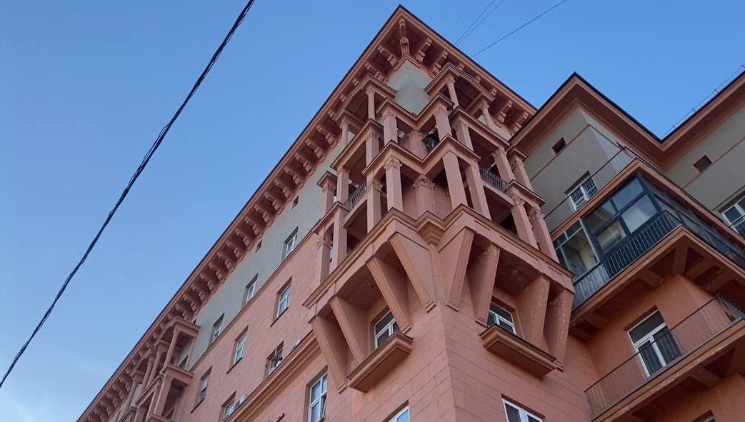 Кирпичный сталинский дом, 1940 г постройки. Дом предназначался для заселения выдающихся деятелей советской культуры, науки и высокопоставленных чиновников. Элементы декора, балконные плиты и ограждения, величественные колонны и арки реставрированы и сохранены в изначальном виде. Дом огорожен. Въезд во двор под шлагбаум.