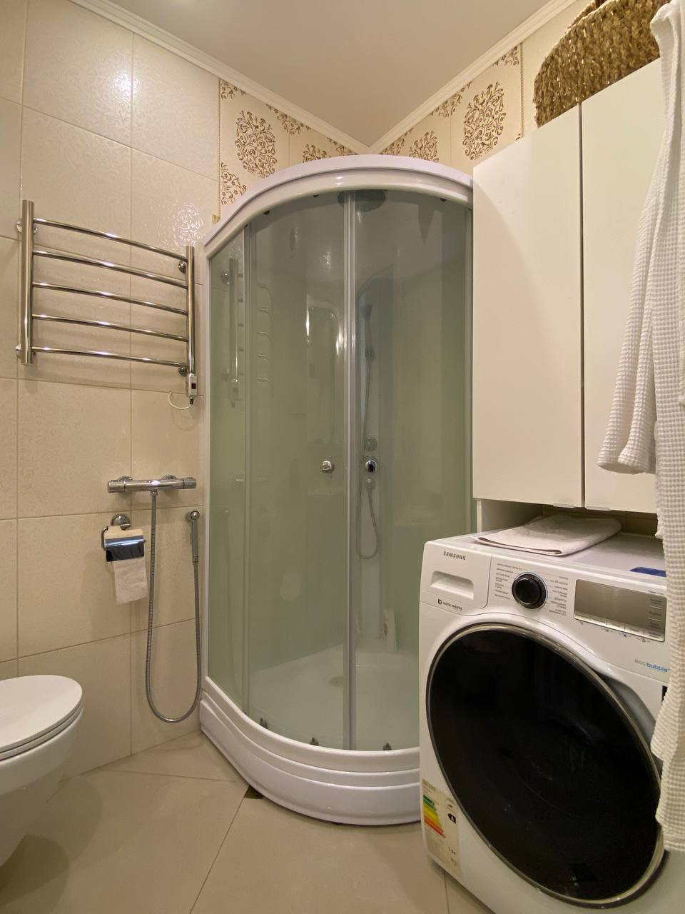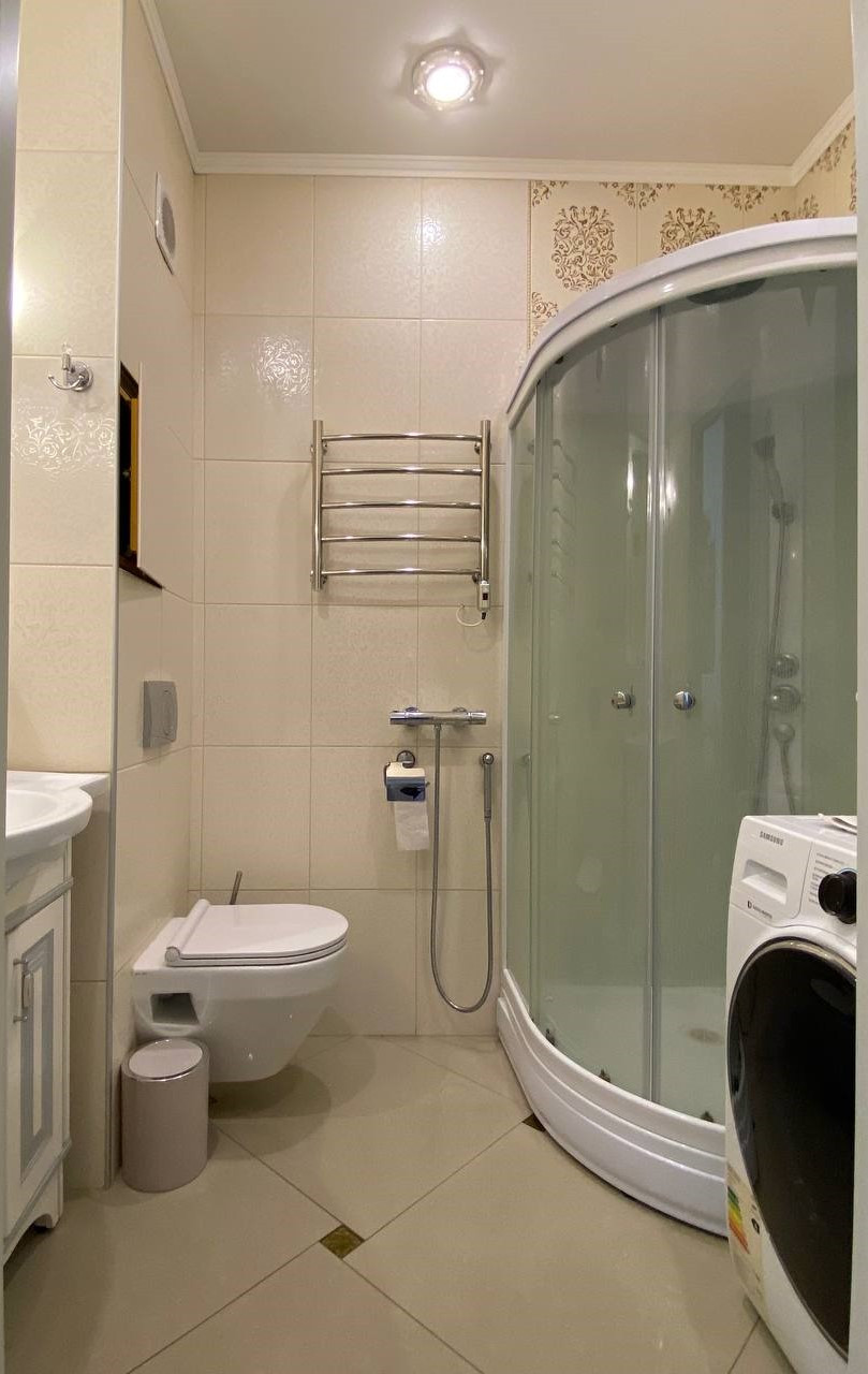 Из окон кухни и спальни открывается великолепный вид во двор и на Москва-Сити. Санузел совмещен. В ванной установлен теплый пол. По желанию покупателя мебель и техника останется