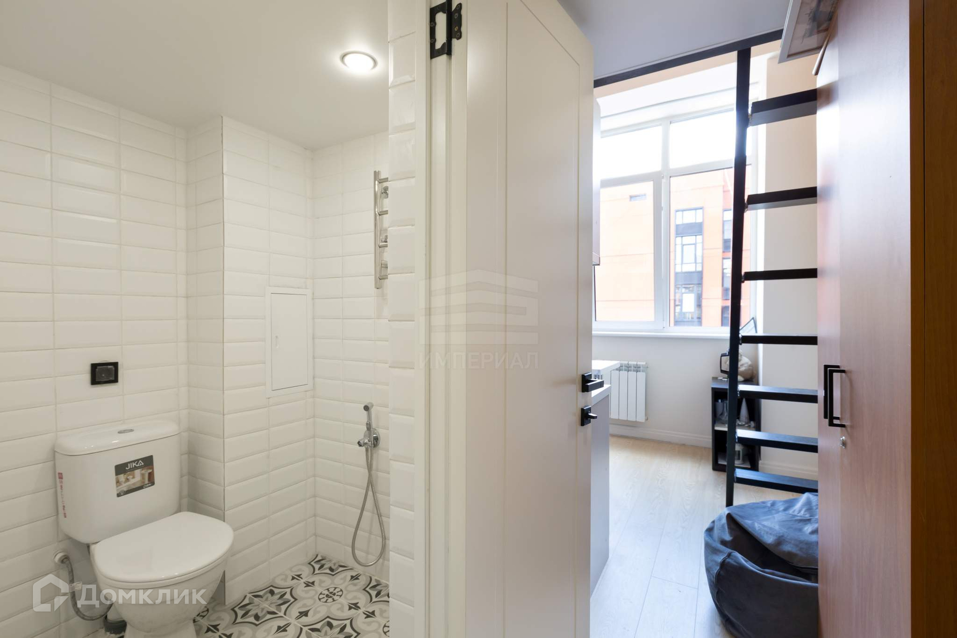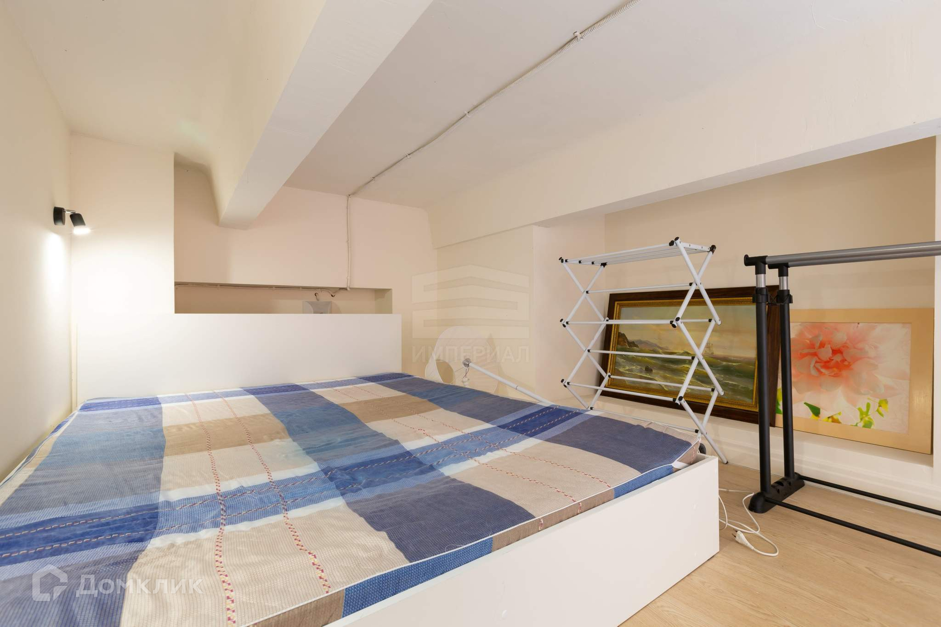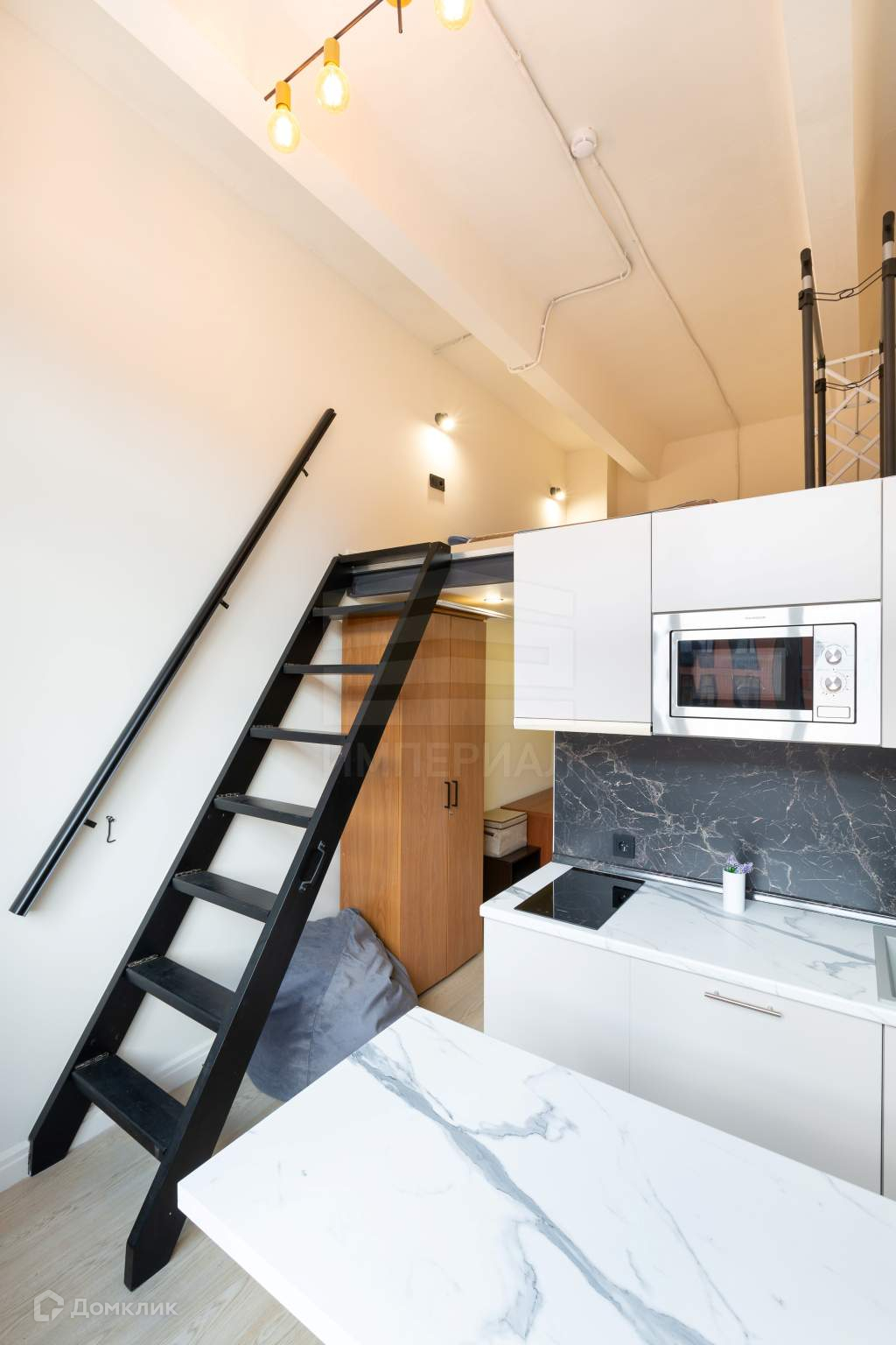 Студия с большим окном, с установленными двухкамерными стеклопакетами, отделка выполнена в светлых нейтральных тонах, сборная мебельная антресоль и высокие потолки (3,75 м) позволяют увеличить используемое пространство.