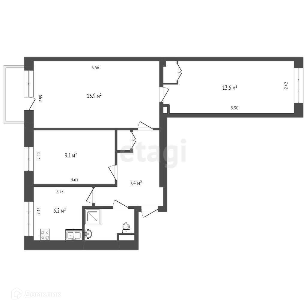 Общая площадь 57.6 м2