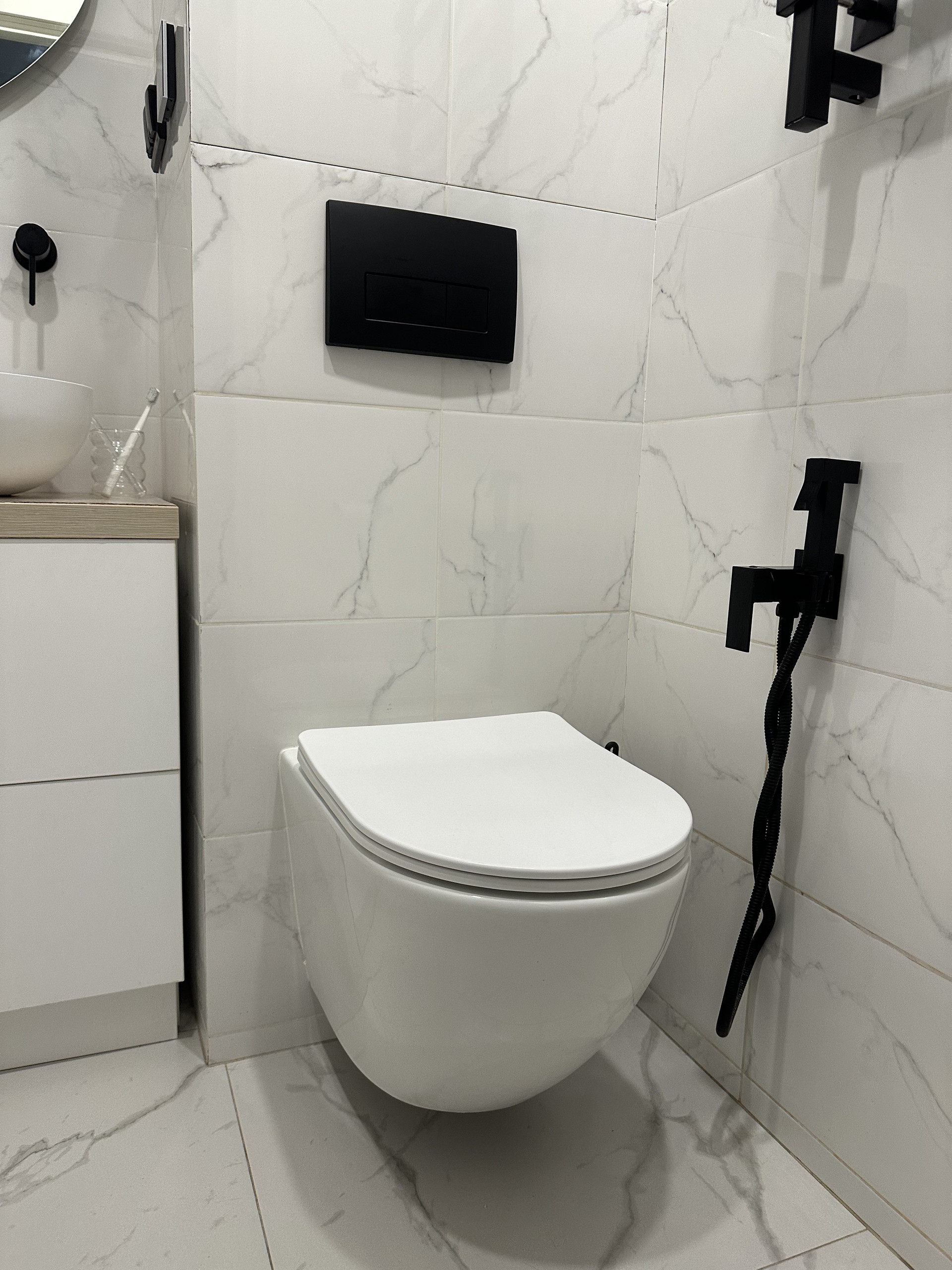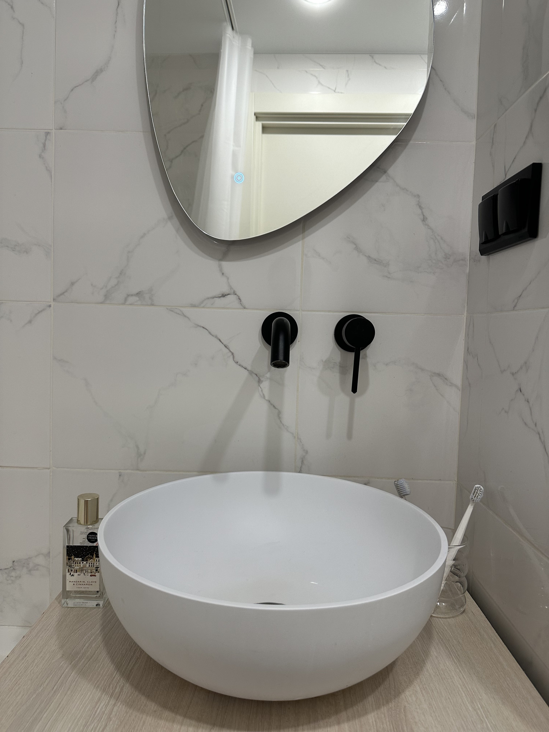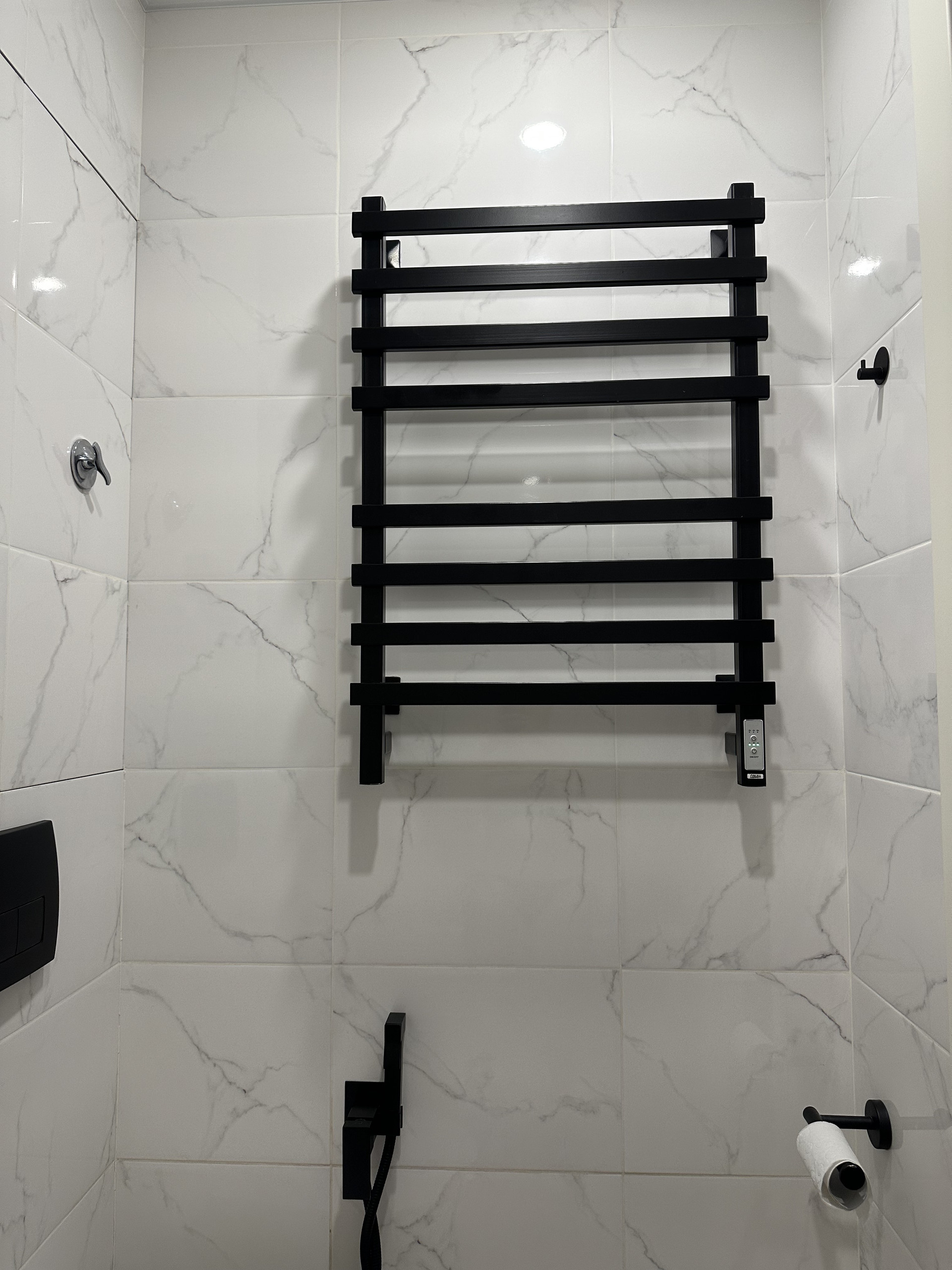 В санузле душевая система Boheme, дизайнерские радиаторы, раковина, сантехника.