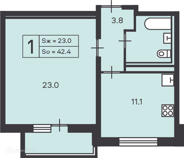 Общая площадь 42.4 м2