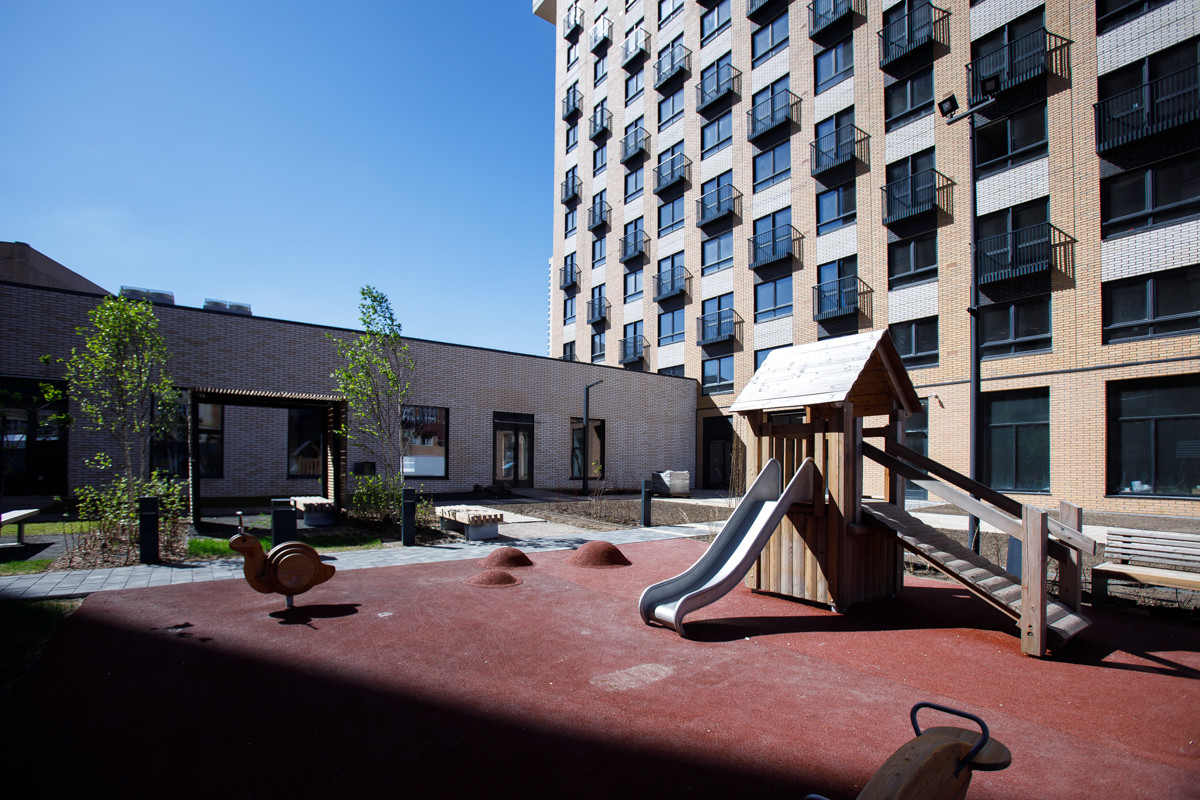 На первых этажах предусмотрены коммерческие помещения с отдельными входами. Во дворах обустроены безопасные детские площадки с покрытием из резиновой крошки, которые хорошо просматриваются из окон. Чуть оборудованные спортивные площадки, дорожки и скамейки для отдыха. Общая площадь озеленения вокруг дома – более 1 800 кв. м, включая деревья, кустарники, цветники и цветущие газоны. На -1 этаже дома также расположены индивидуальные кладовые для жильцов площадью от 4,8 до 8,4 кв. м.