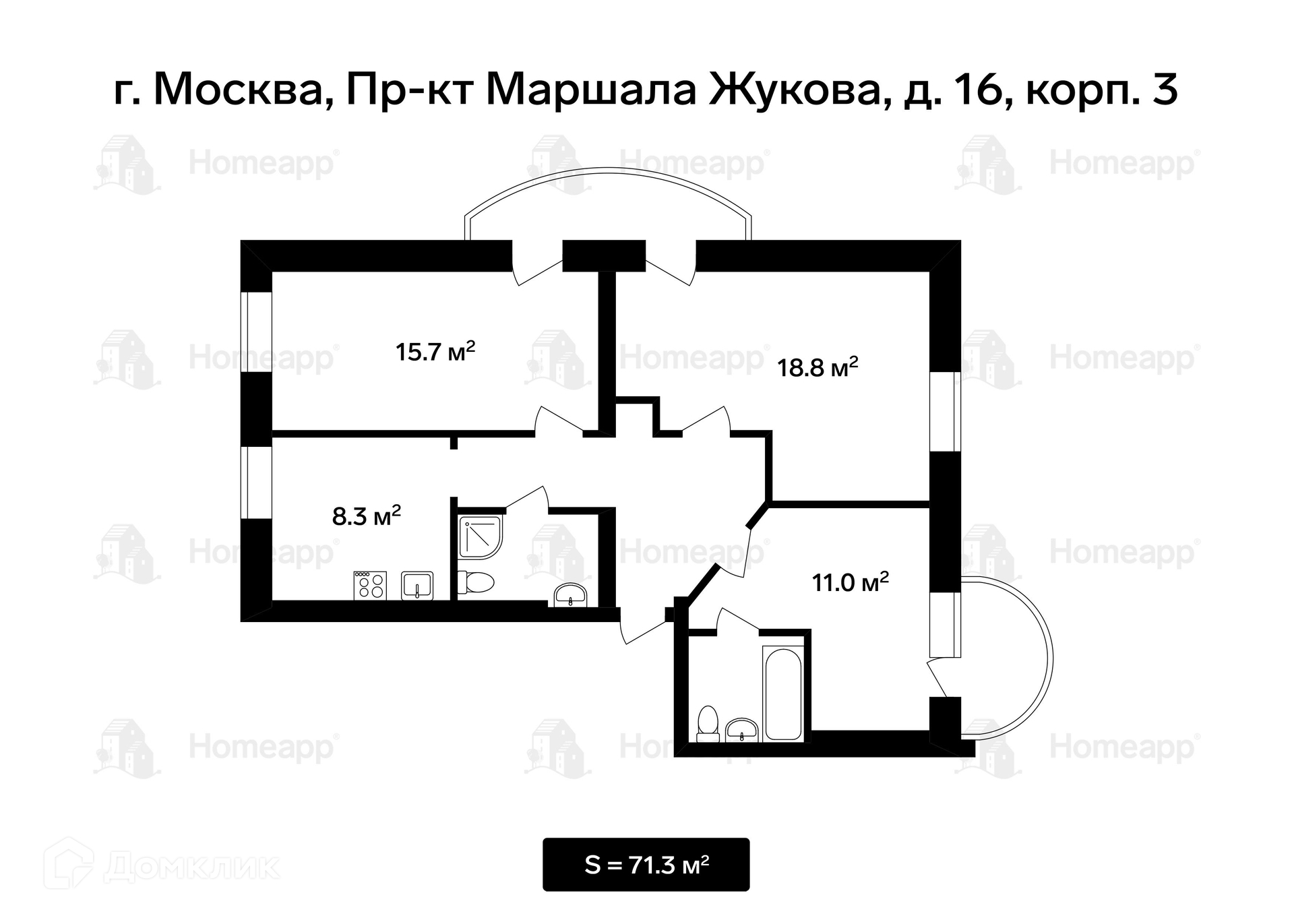 3-комнатная квартира, 71.3 м2, этаж 6 / 7, на продажу в Москве, проспект Маршала Жукова, 16к3