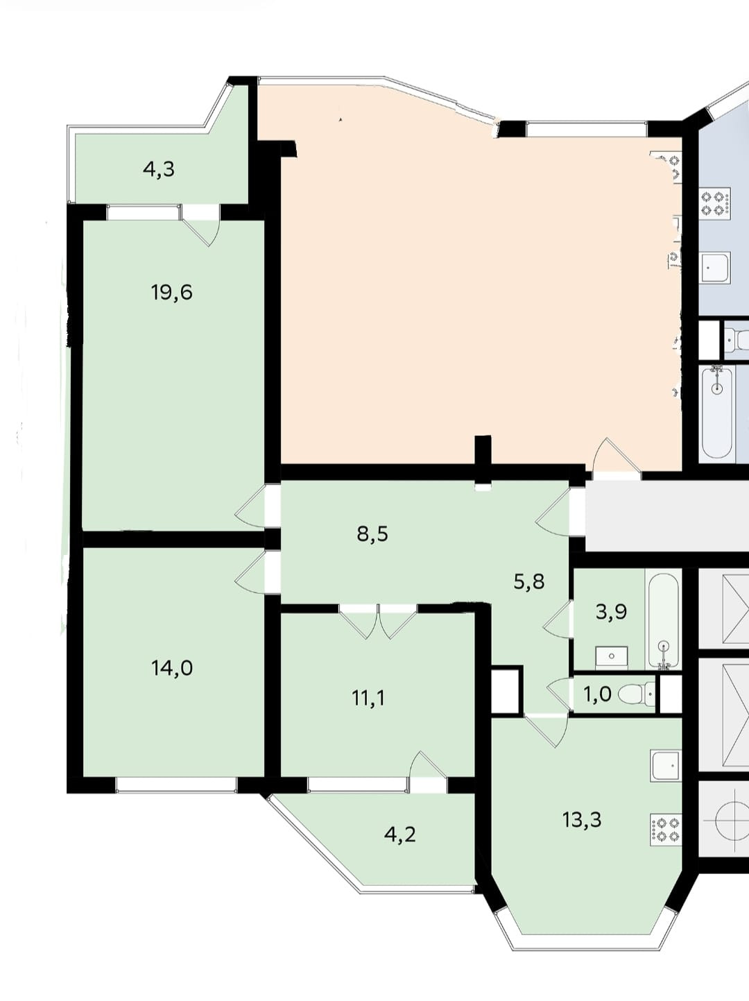 Жилая площадь 43.4 м2