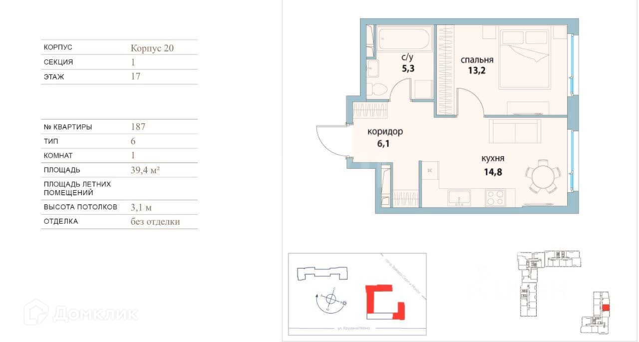 Общая площадь квартиры 39,4 кв. м