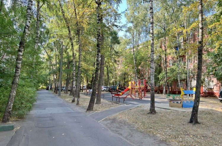 Тихий зеленый двор с детской и спортивной площадкой.