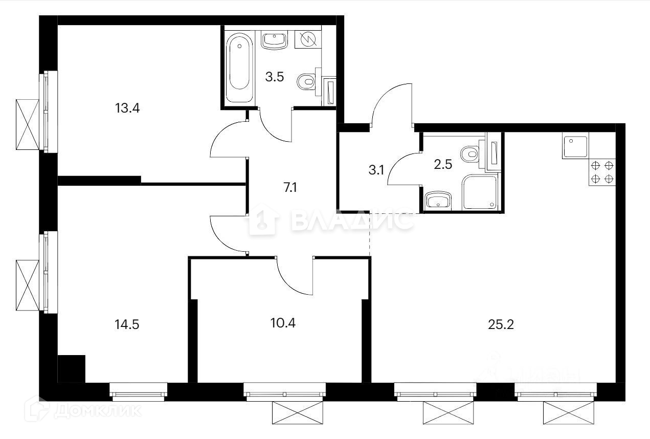 Вас ждет просторная кухня-столовая, 3 изолированные комнаты, 2 совмещенных санузла и холл и окна в закрытый двор.
