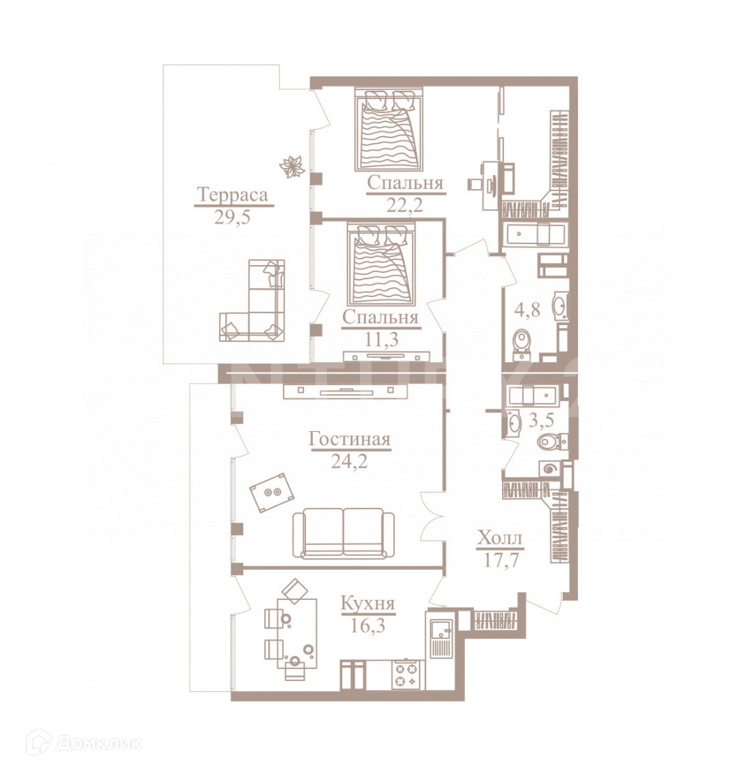 • Эксклюзивное преимущество квартиры и отличительная черта дома премиум-класса— терраса 29,5 м2 для летних вечеринок, наблюдения за звездами и организации домашней оранжереи или хоум-офиса.