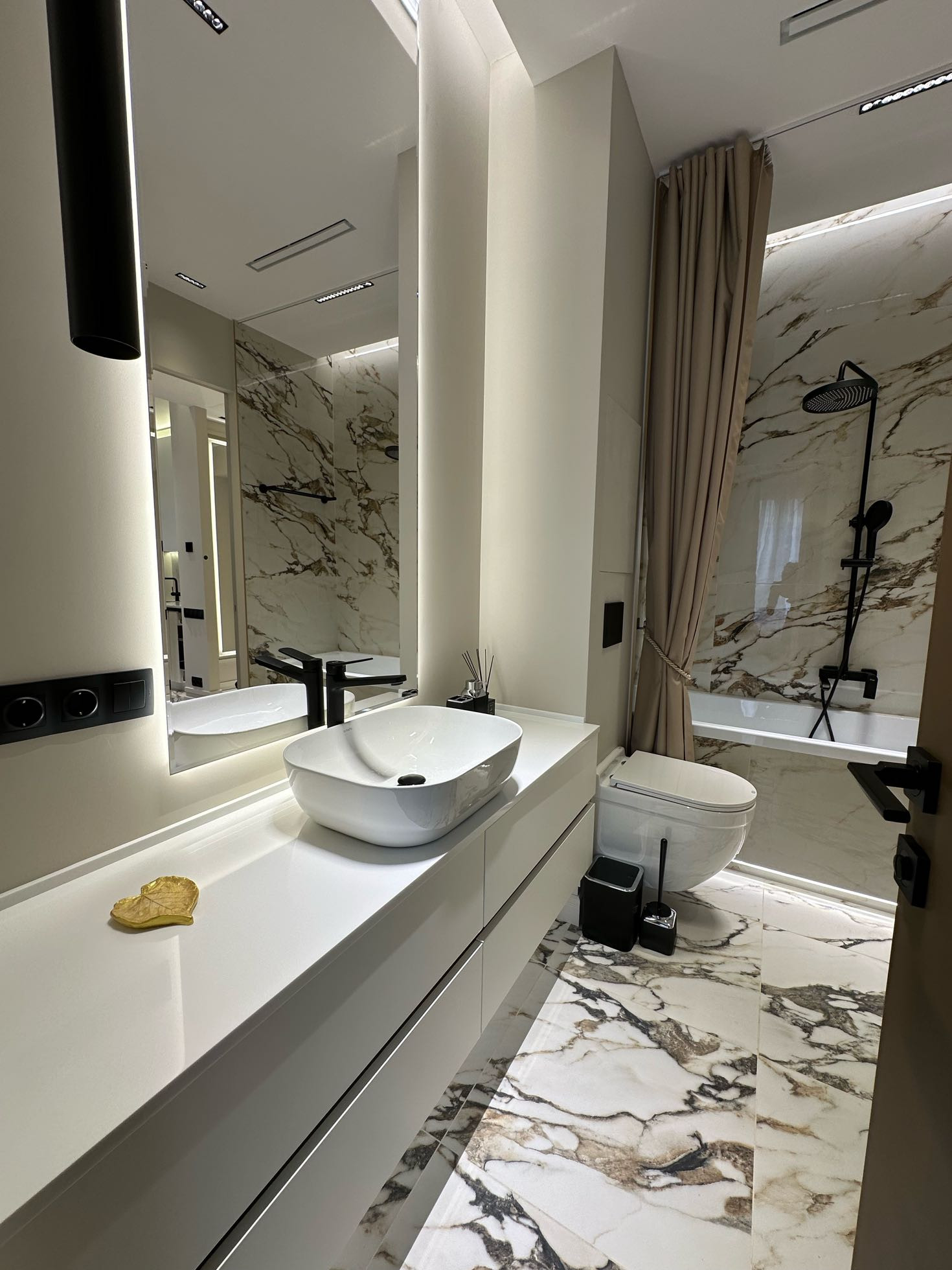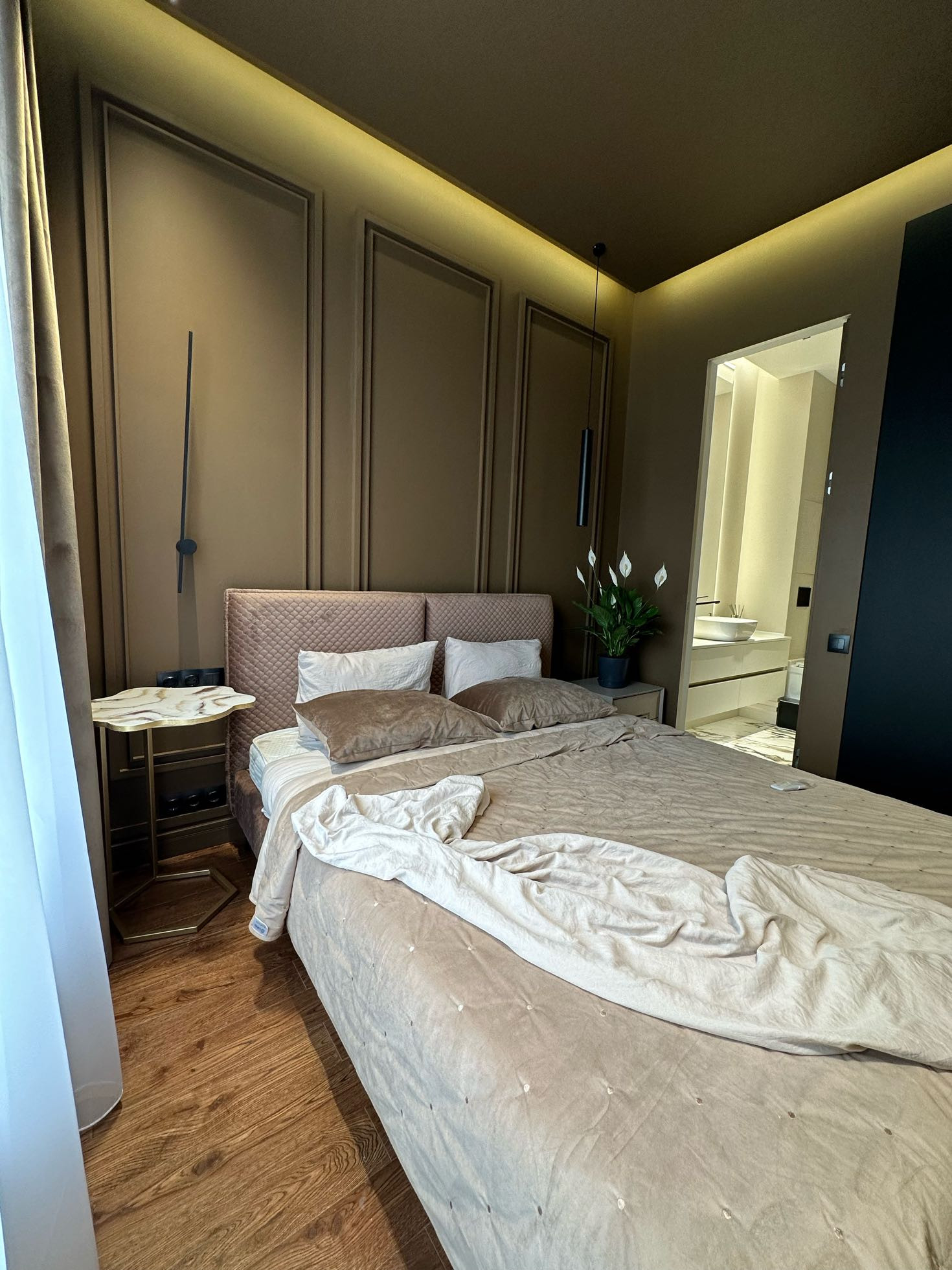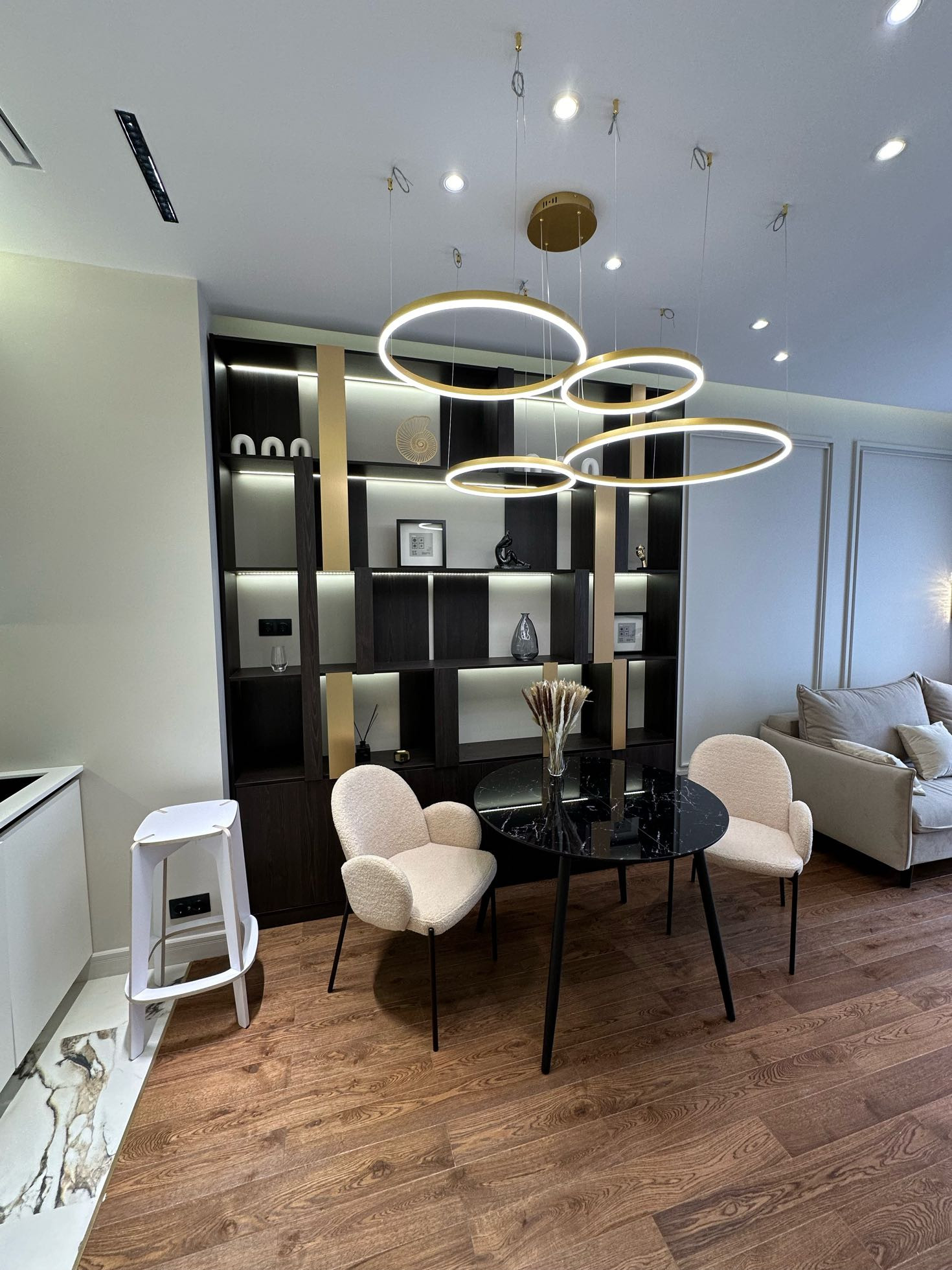 Детали ремонта: парящие потолки, канальная система кондиционирования и вентиляции, несколько режимов света, стены покрашены, на полу дерево, в санузле керамогранит, теплые полы, скрытые двери 2,5 метра высотой. Вся мебель выполнена на заказ по проекту.