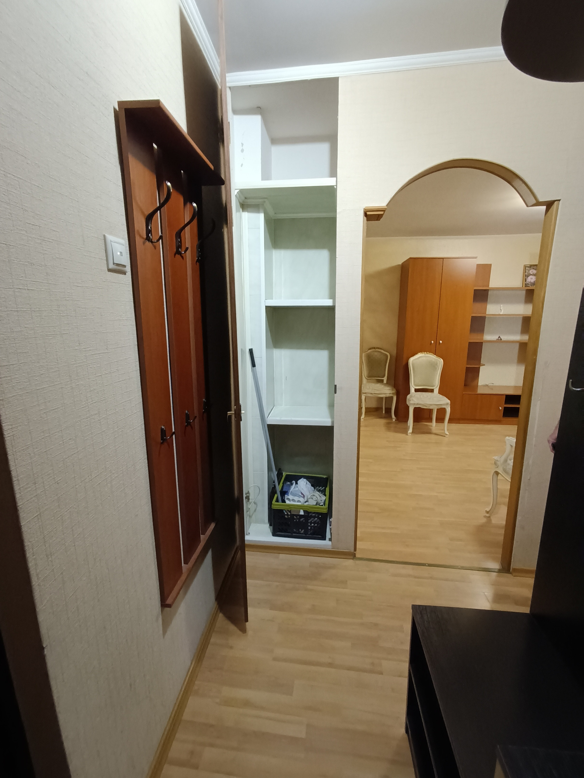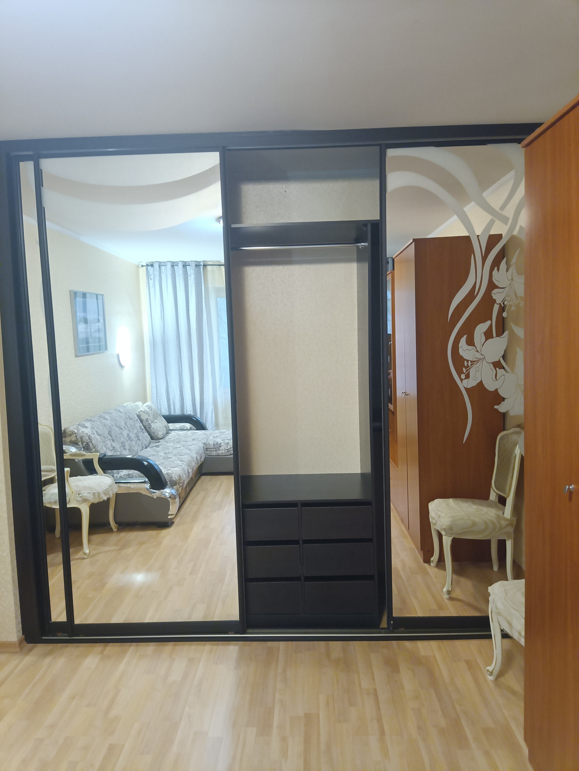 В комнате вместительный шкаф-купе, кухня бренда "Стильные Кухни" с доводчиками, бытовая техника, все остается.