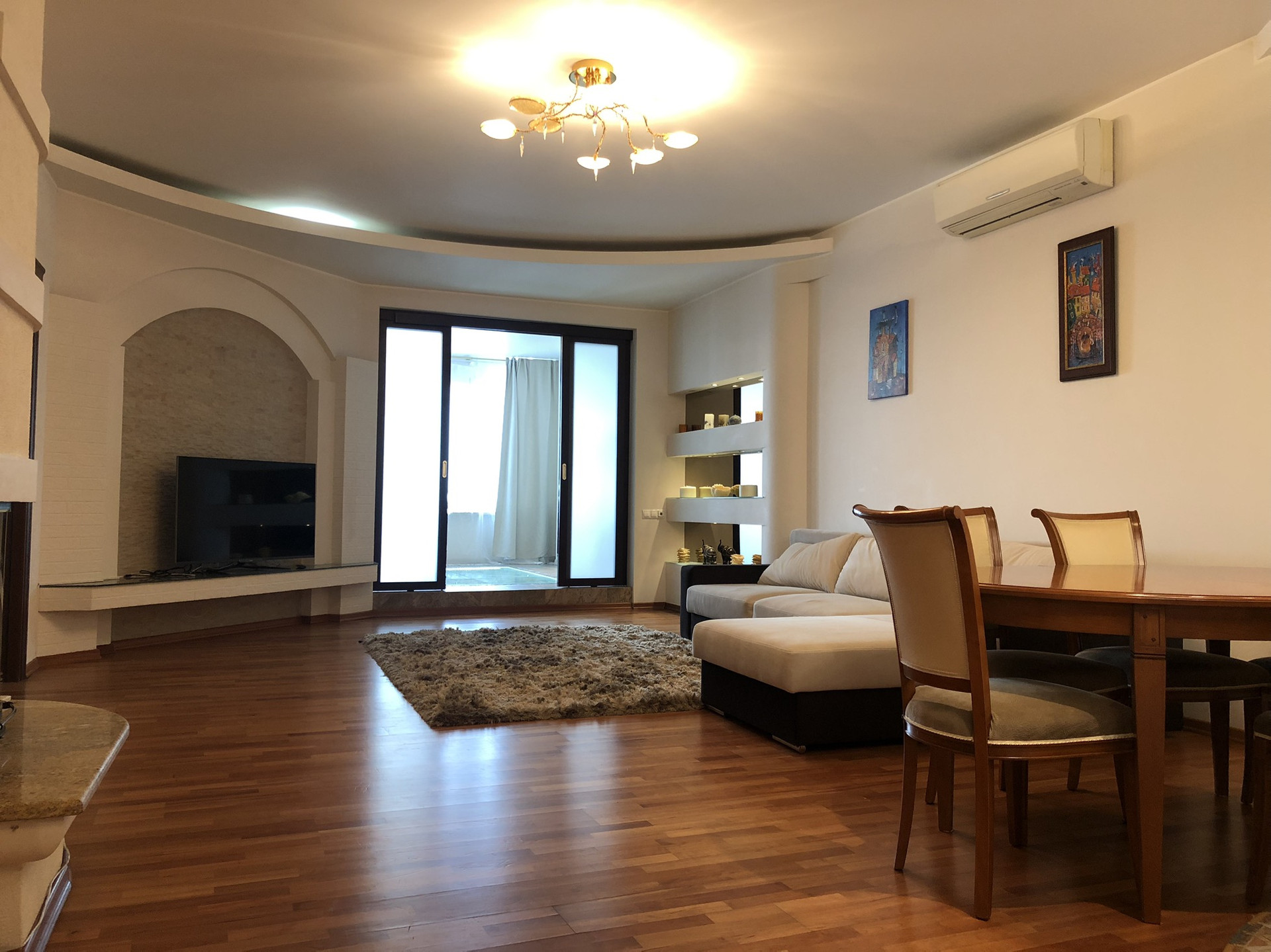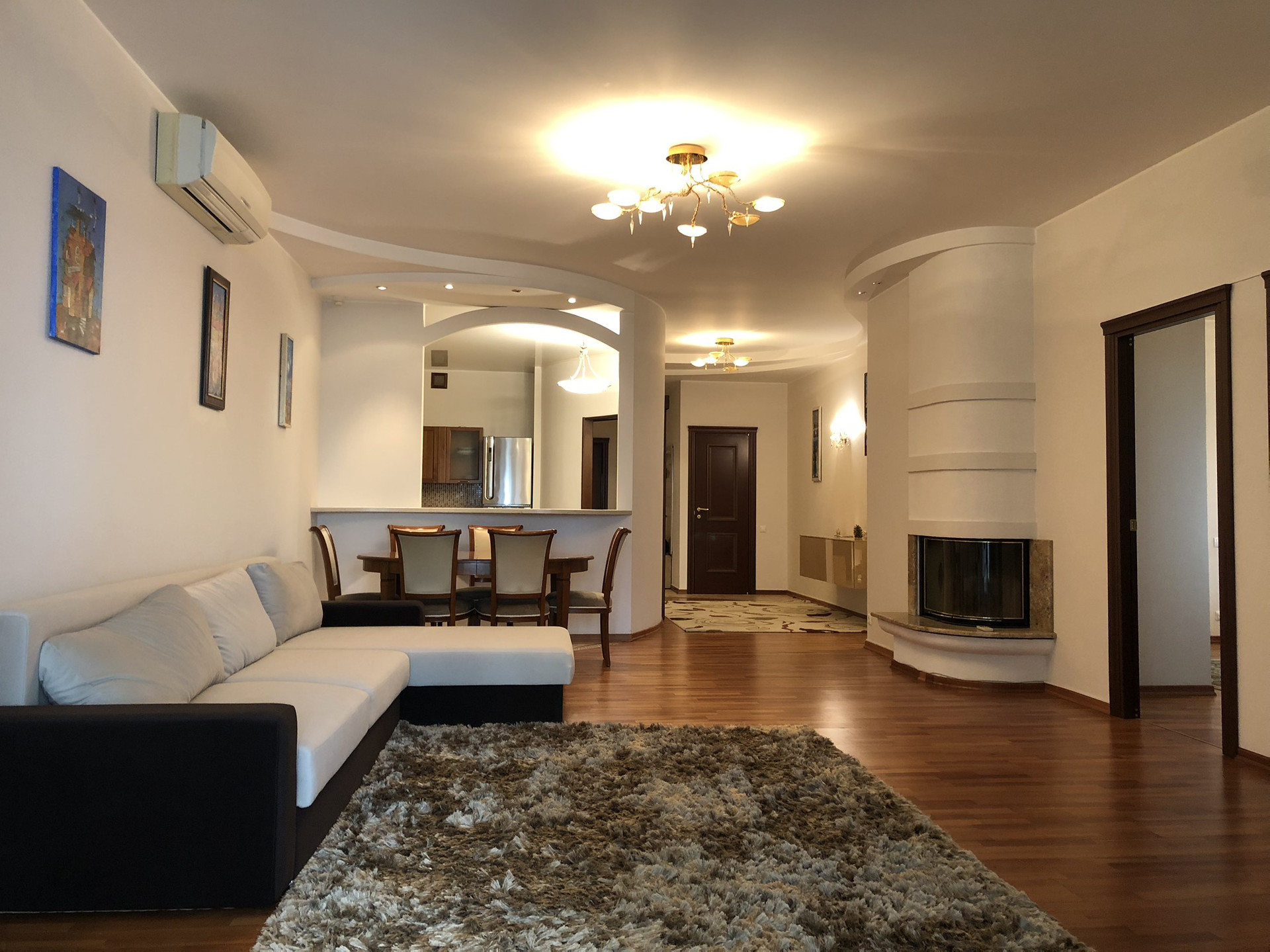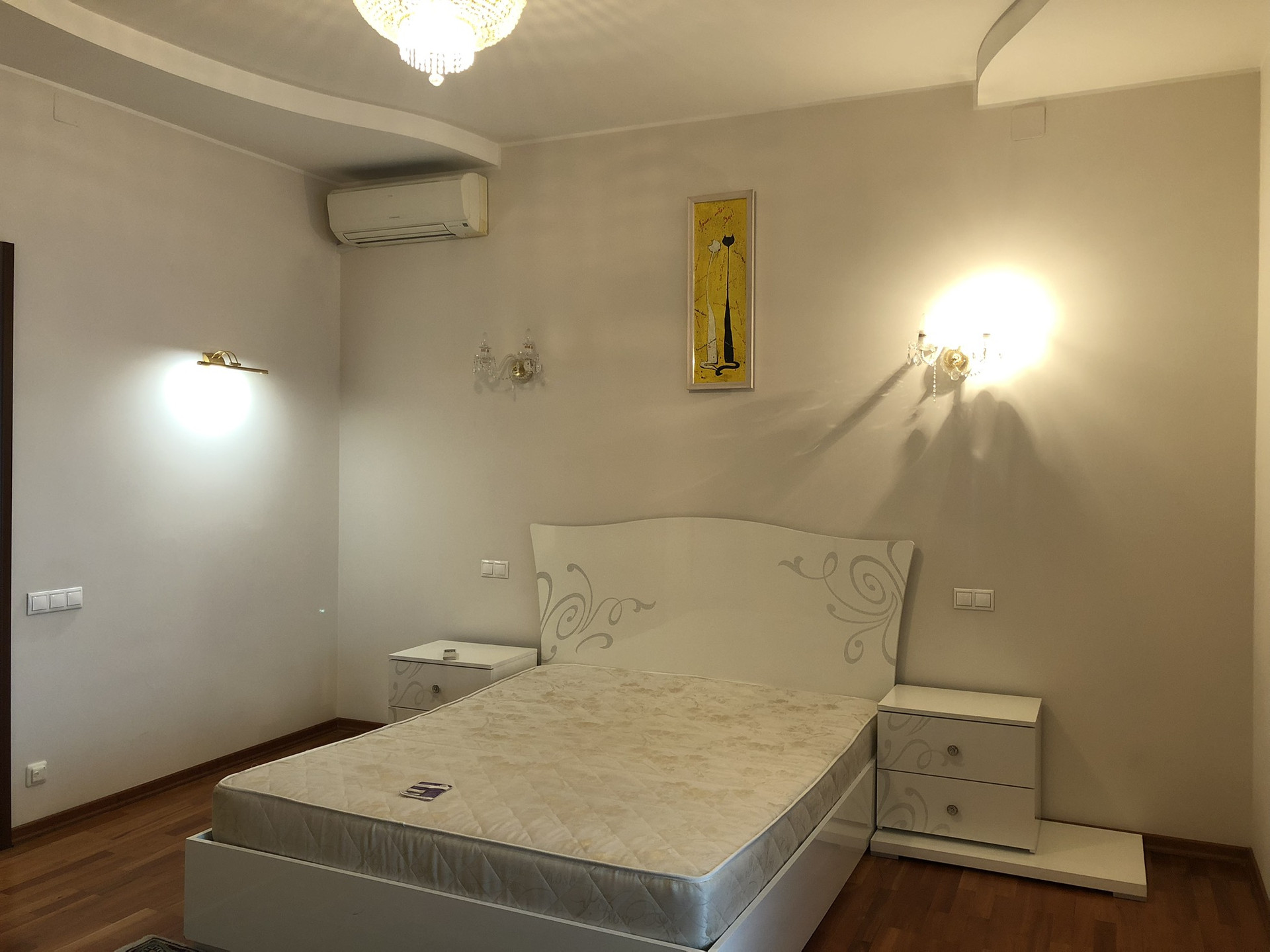 Жилой комплекс Кунцево. Общая 132 (кв.м) Гостиная, есть 2 спальни и кухня- столовая. Полы- ламинат, в санузлах - плитка. Большая гардеробная комната и кладовка. Санузлы (2 шт.) -ванна, душевая кабина, биде, бойлер. Система кондиционирования. В доме 2-хуровневый подземный паркинг и большая наземная парковка.