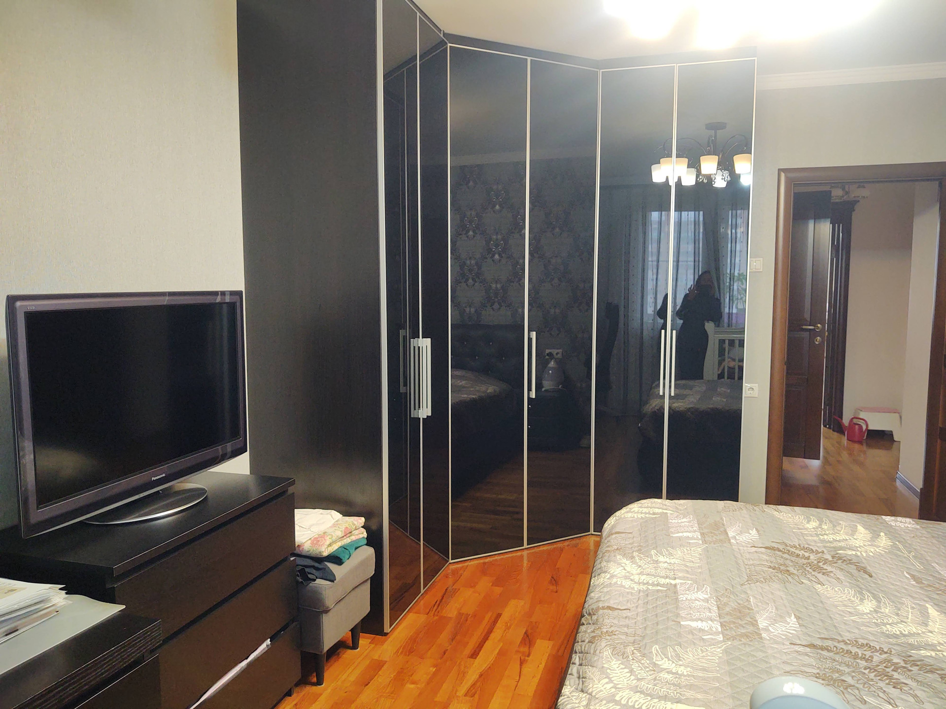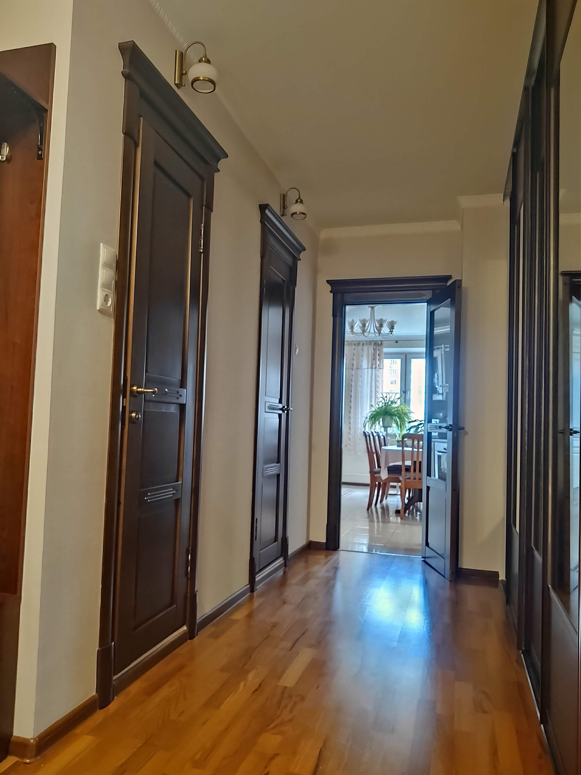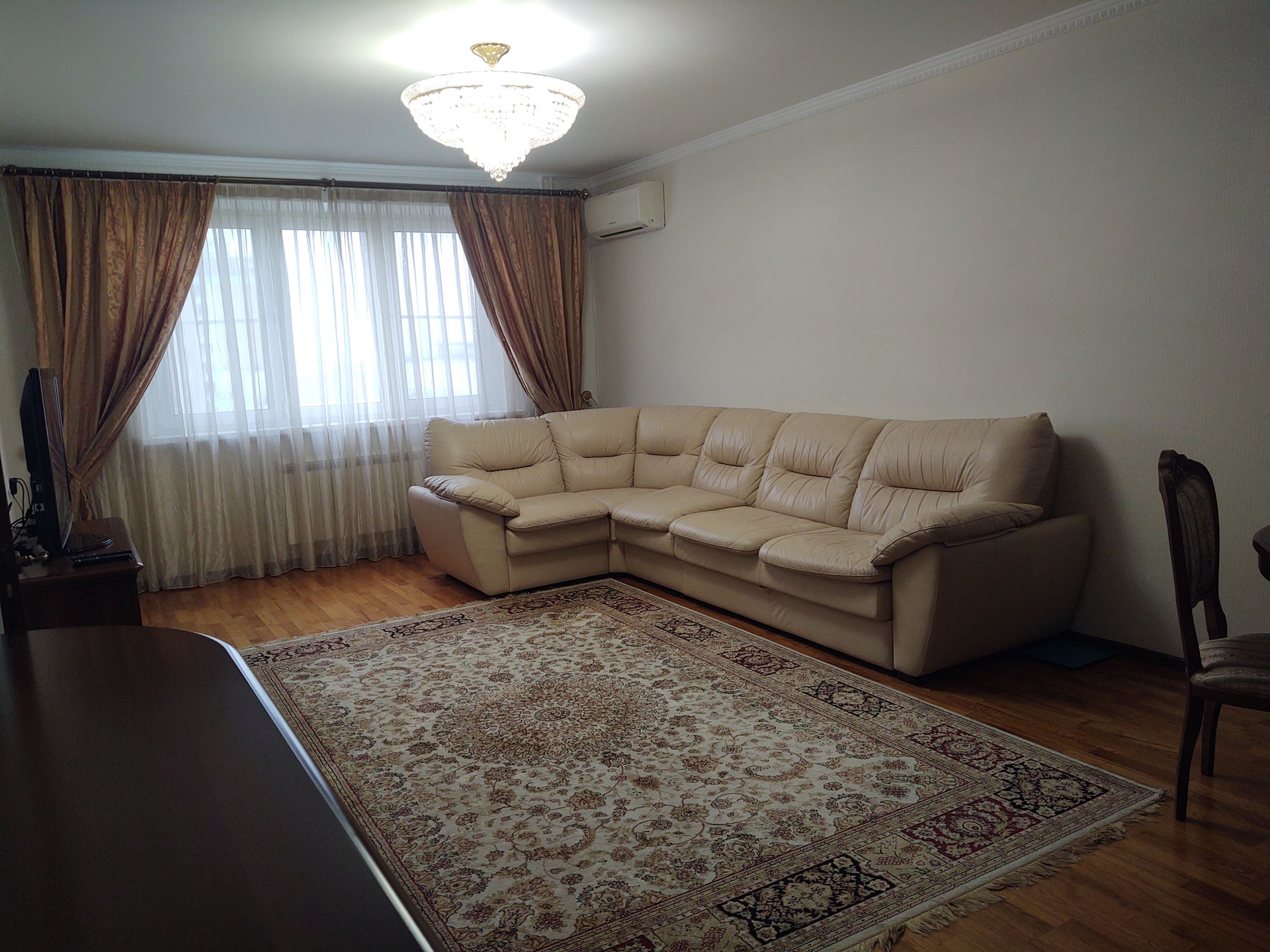 Продается красивая трехкомнатная квартира, общая площадь 130 кв метров, 14 этаж 25 этажного панельного дома, серия П44-ТМ-25.  Просторная кухня 21 кв метр, жилая 65 кв метров, 2 санузла, кладовка-постирочная. Есть застекленный балкон. Выполнен качественный ремонт с использованием дорогих материалов (обои, паркетная доска, плитка). Теплый пол на балконе, кондиционеры в каждой комнате и на кухне.